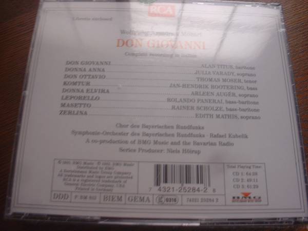 ドンナ・アンナ … ユリア・ヴァラディ ( S ) ドン・オッターヴィオ … トーマス・モーザー ( T ) ドンナ・エルヴィラ … アーリーン・オジェー ( S ) 騎士長 … ジャン=ヘンドリック・ルータリング ( B ) レポレッロ … ローランド・パネライ ( B・Br ) マゼット … ライナー・ショルツ ( B・Br ) ツェルリーナ … エディト・マティス ( S ) 合唱 … バイエルン放送合唱団 指揮 : ラファエル・クーベリック 管弦楽 : バイエルン放送交響楽団 |