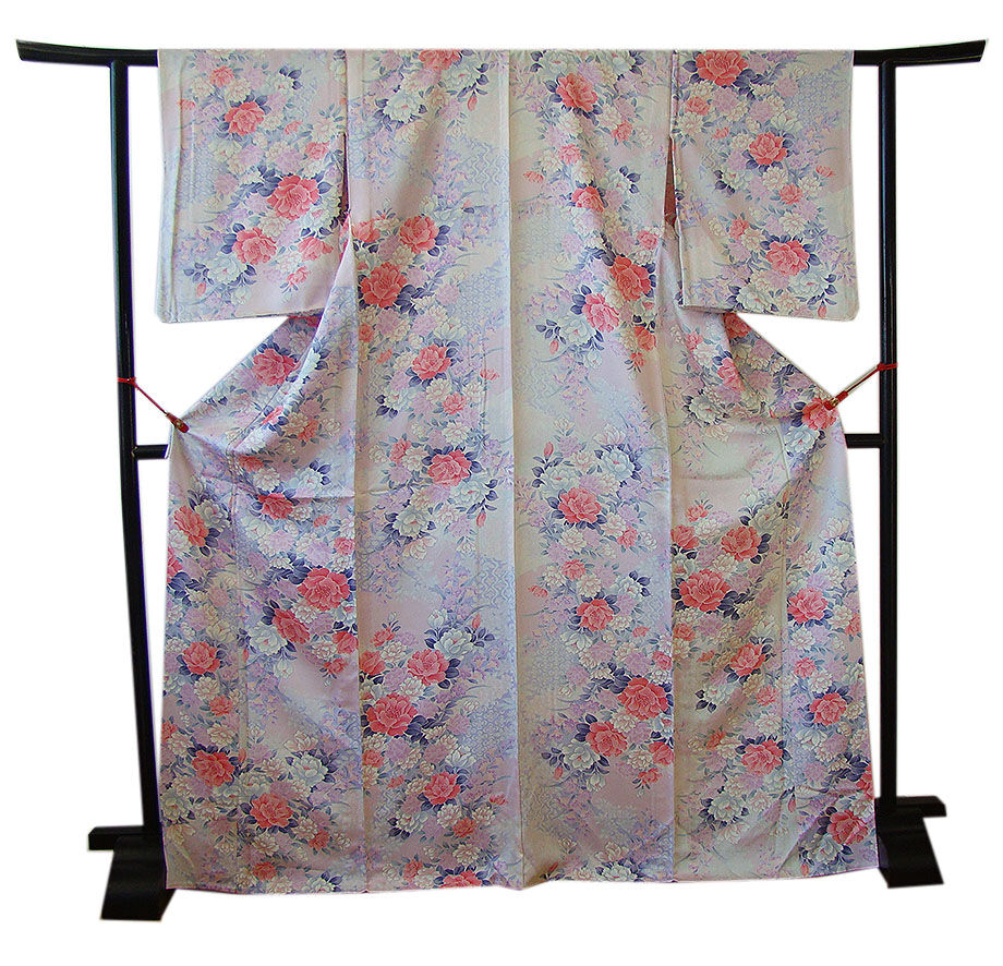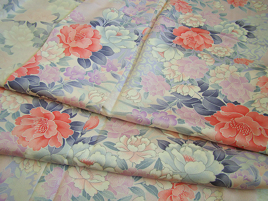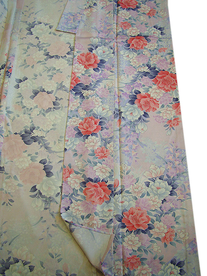 淡い撫子色地に白、桃色、グレー、藤色、薄紅梅色等の花木柄の染柄。