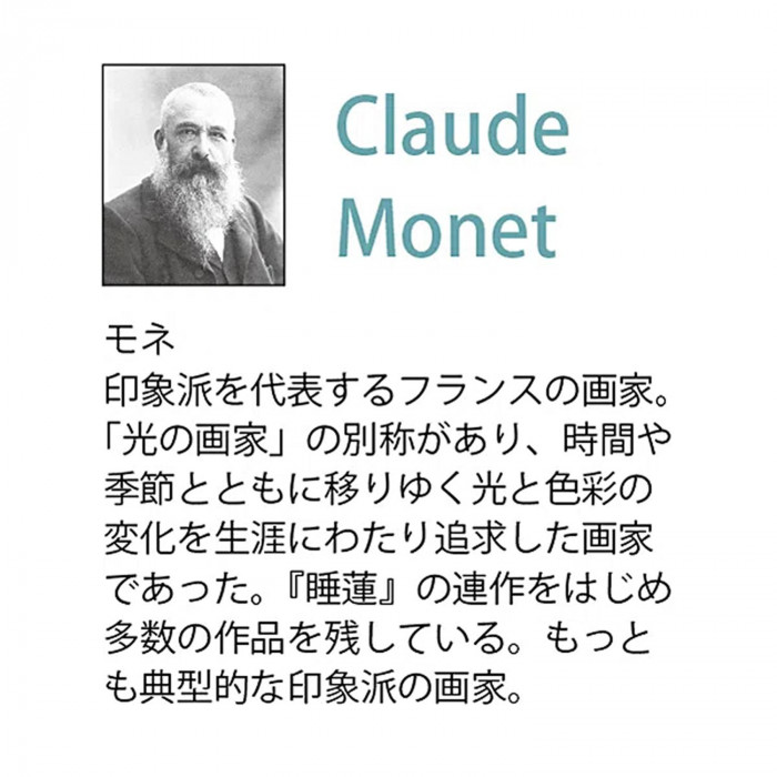 | 絵と額がセットになった商品です。 作家:モネ(フランス男性作家) 印象派を代表するフランスの画家。「光の画家」の別称があり、時間や季節とともに移りゆく光と色彩の変化を生涯にわたり追求した画家であった。「睡蓮」の連作をはじめ多数の作品を残している。モネは終生印象主義の技法を追求し続けた、もっとも典型的な印象派の画家であった。 |