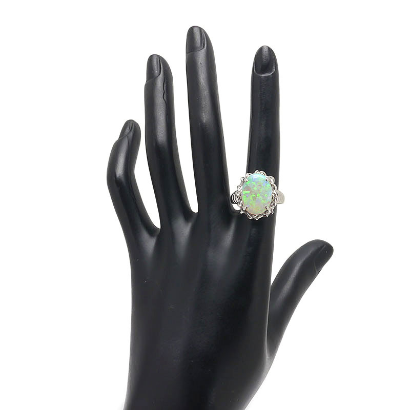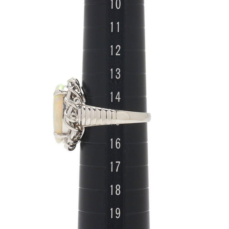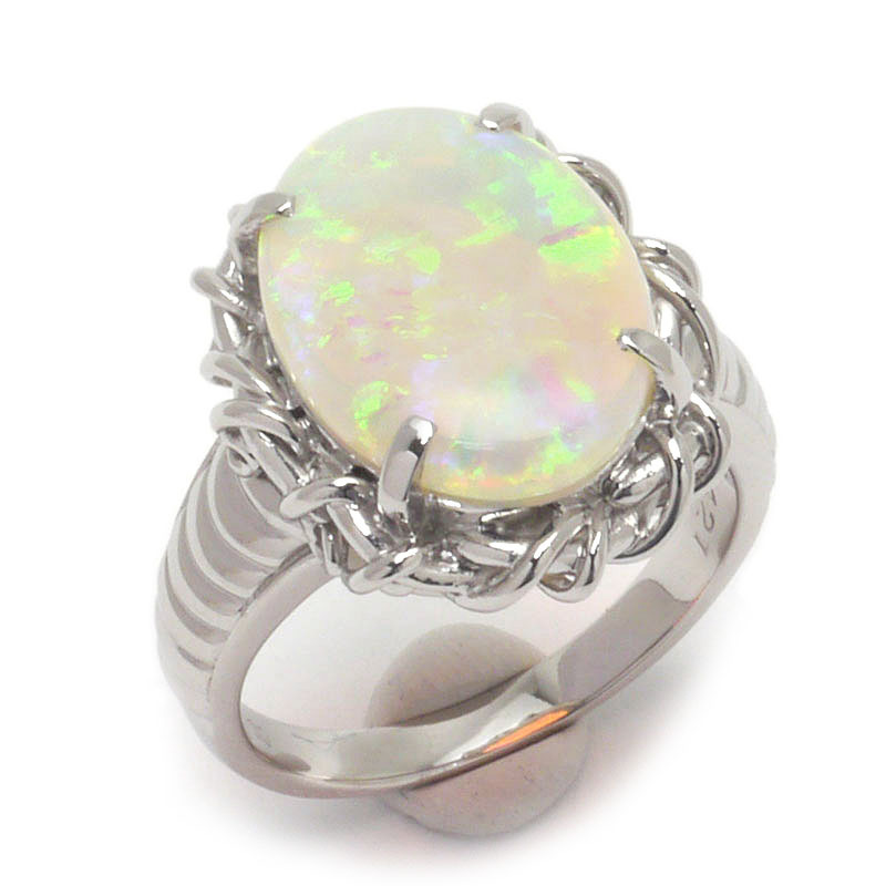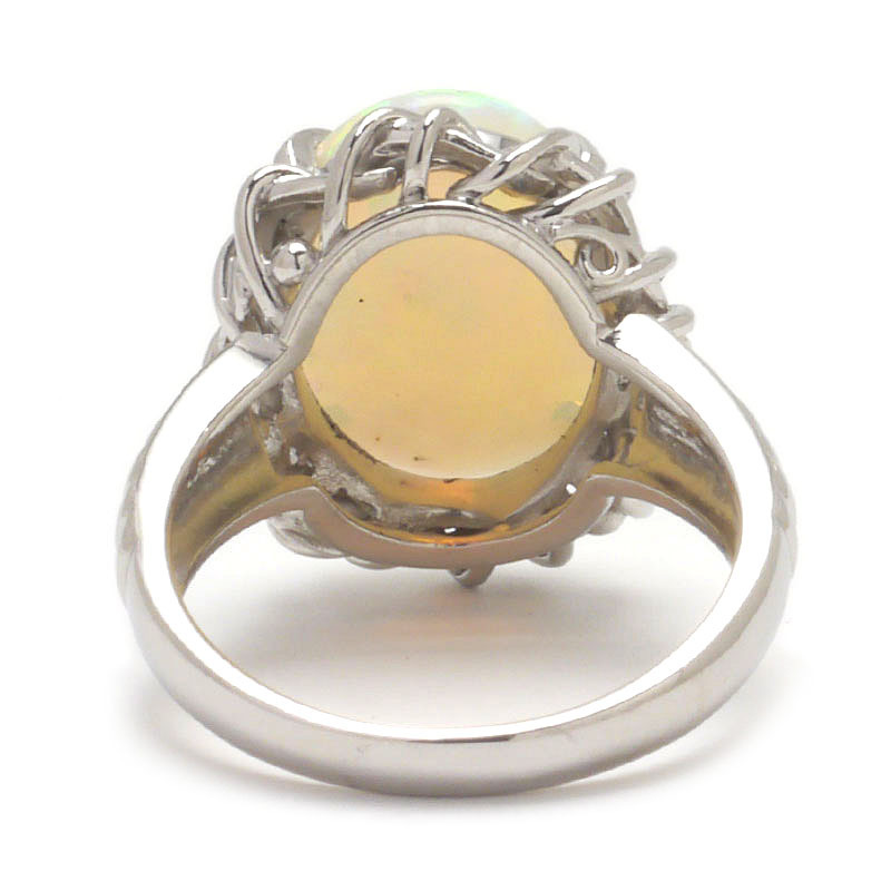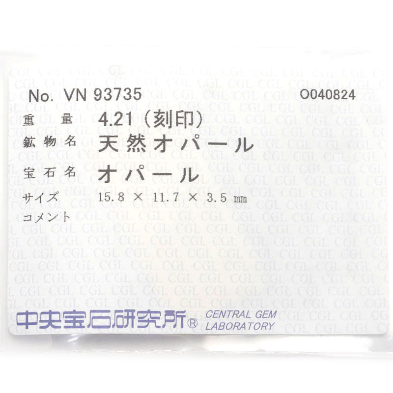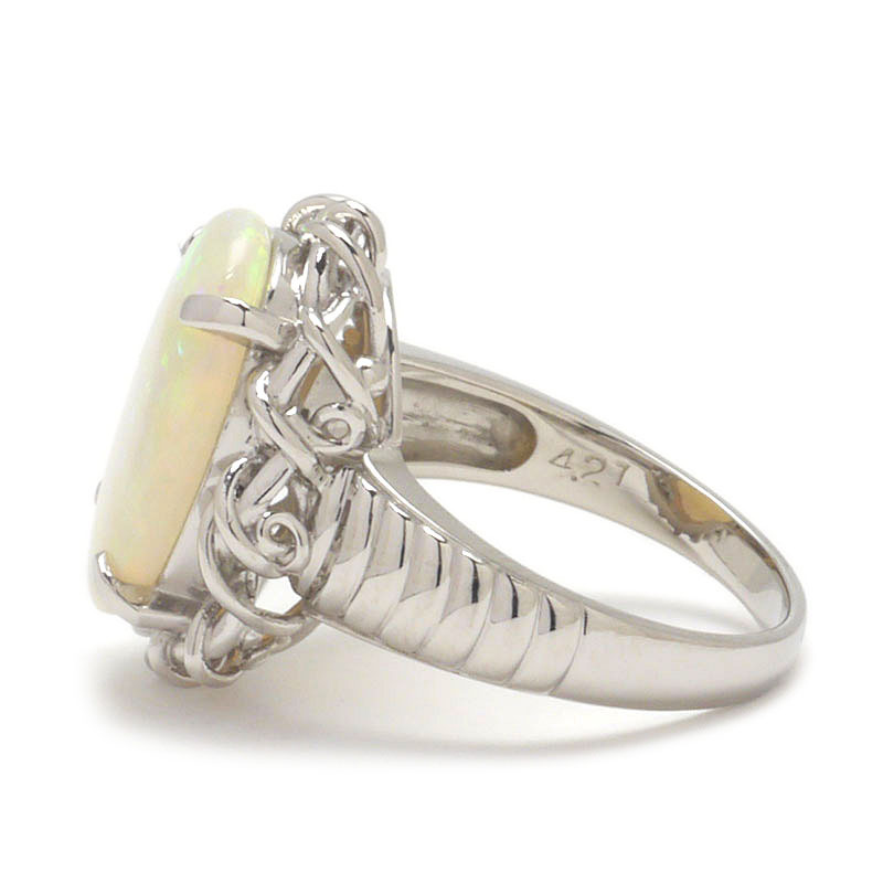 【中石・脇石】平たいラウンドカットのホワイトオパールで、オレンジ系の斑がしっかりと確認できる、綺麗な印象の石がセレクトされています。