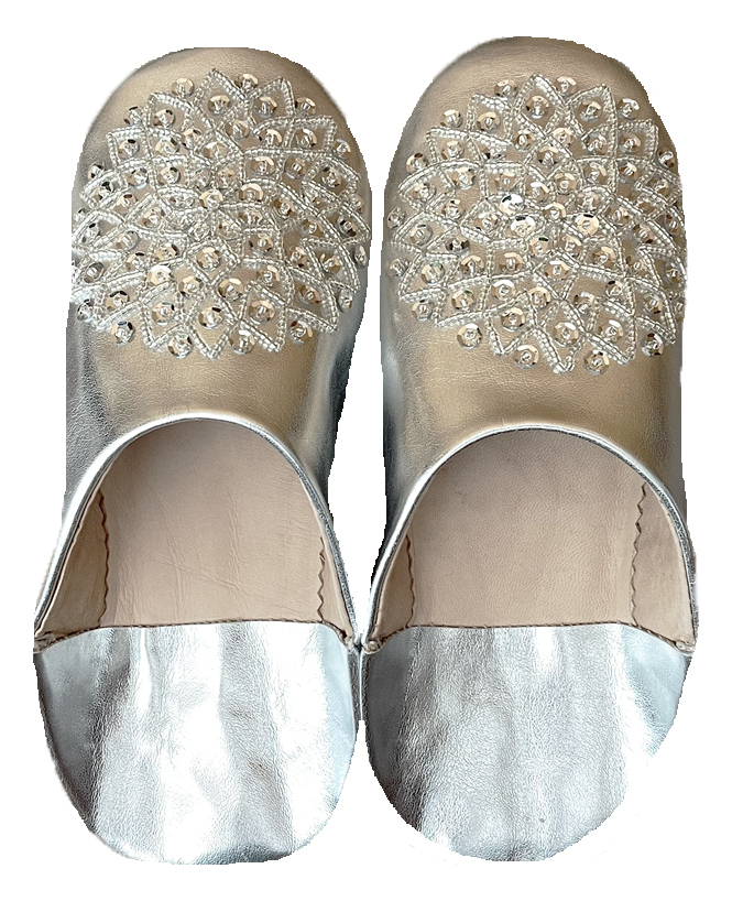 当店のバブーシュはすべてモロッコの職人さんが手作りで作製したものです。工場で作った大量コピー製品ではないので小さな傷・汚れ、染色の際のむら、ボンドのはみだし、ボールペンの跡、若干のサイズの誤差、同じデザインでも左右非対称、入荷時によって画像とのデザインやスパンコールの色の違いなどのハンドメイド感についてはご了承のうえ、ご注文をお願いいたします。上記のことを踏まえての価格設定となっております。