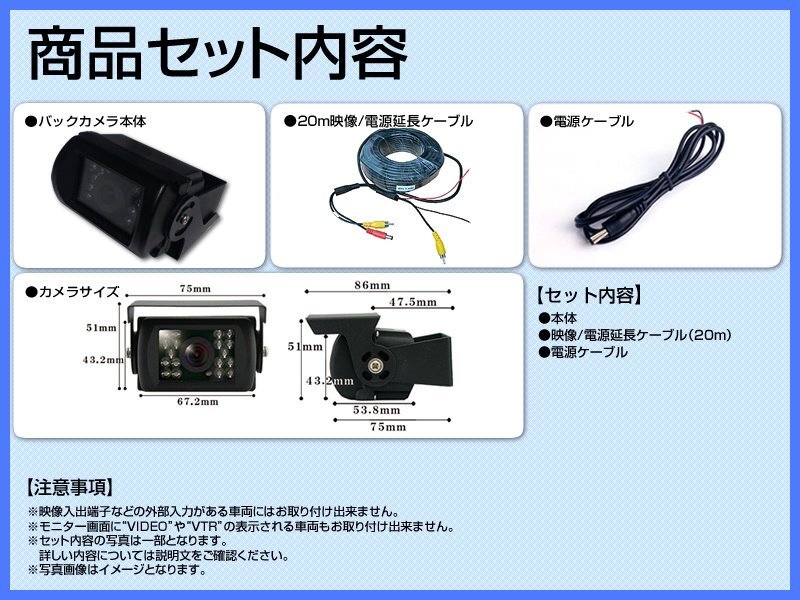 | ・バックカメラ本体 × 1 ・電源ケーブル × 1 ・電源/映像延長ケーブル 20m × 1 |
