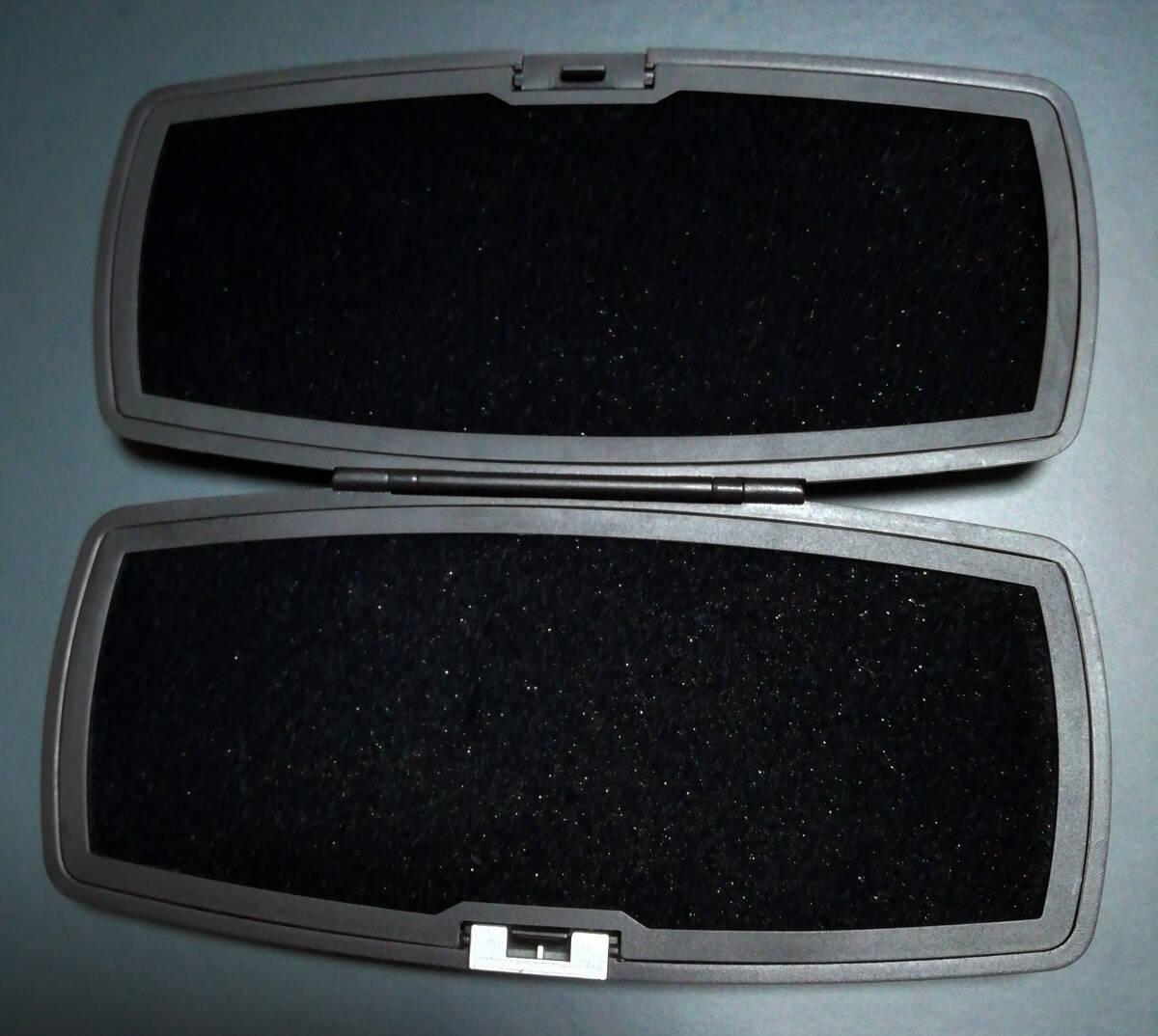 ピュアアルミニウム+ラッカー仕上げ+マイクロファイバー(黒)。画像5のように内側はラメのようにキラキラした風味のある素材で低反発ウレタン(?)のようなクッション性があり、蓋を閉めると挟み込むタイプです。