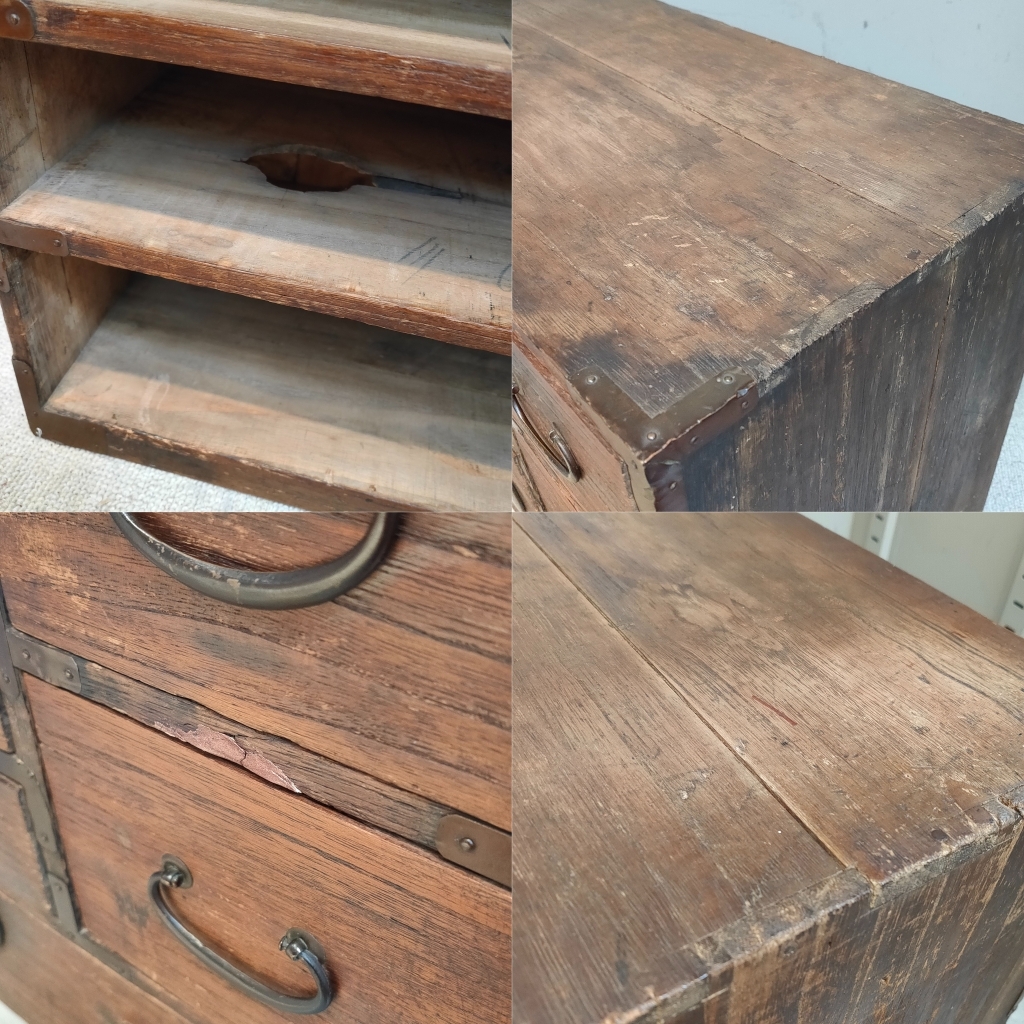 画像にあるものが全てです。 サイズ :約48×25×高さ35cm 傷、打痕、ひび割れ、亀裂、虫食い穴、削れ、剥げ、汚れ、ヤケ、変色,、破損、修復跡ありなど状態は悪いです。 状態を気にされる方は入札をご遠慮ください。 | ||||