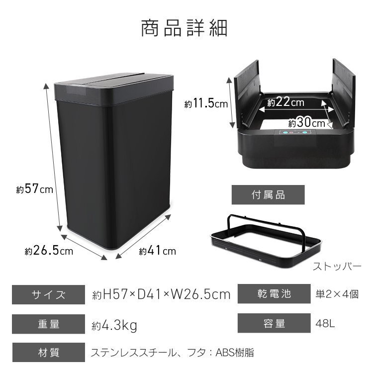| とっても便利!センサーでフタが自動開閉! 手をかざすとセンサーが感知してフタが開きます。 直接手を触れずに開けられるので、とっても衛生的です! 台所はもちろんのこと、赤ちゃんのおむつ捨て、医療の現場にもぴったりです! 手動で開閉OK! 操作パネルには、センサーの他に手動で開けたり閉じたりできるするボタンが付いています。 大容量な48Lタイプでシンプルなデザイン。 キッチンやリビングなどに置いてもマッチしやすいです。 ■商品コード:FHB005SL ■商品仕様 カラー:シルバー 容量:48L サイズ:(約)幅26.5cm×奥行き41cm×高さ57cm 重量:(約)4.3kg 使用電池:単二電池×4(別売) 素材:ステンレススチール、ABS樹脂 他 ■注意事項 ・本商品には電池は付属しておりません。 ・商品は、モニターによって色合いが異なって見える場合があります。 ・仕様・デザインは改良のため予告なく変更することがあります。 ■保障期間 7日間 ※商品到着後7日以内の初期不良・破損のみご対応させていただきます。 【新品未使用品です】 |