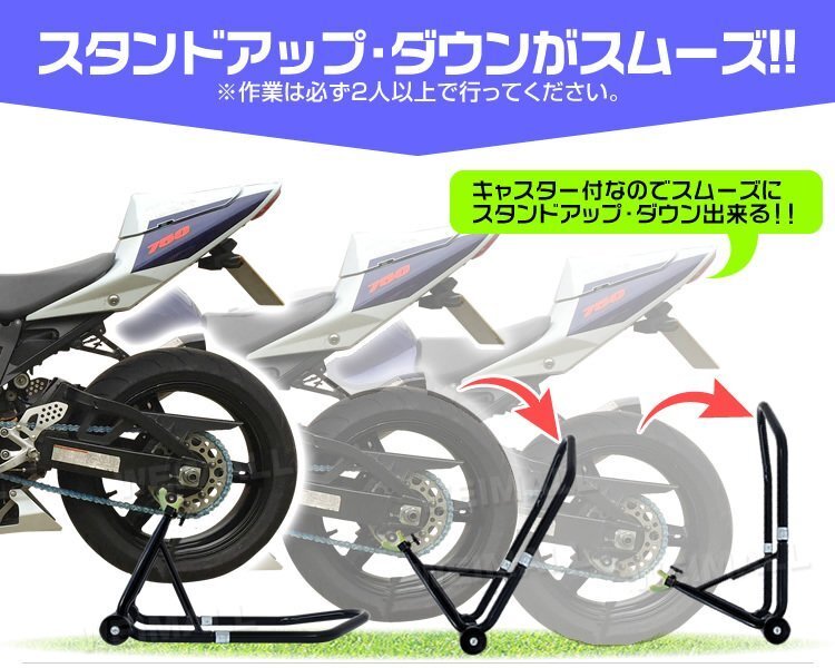 | オートバイメンテナンスにあると便利なリア専用バイクスタンドです。 一見コンパクト、スリムなボディですが軽量ながらも安定した強度をもっております。 組み立て式なので分解して保管・収納出来ます。 キャスター付でスムーズに スタンドアップ・ダウン可能です。 |