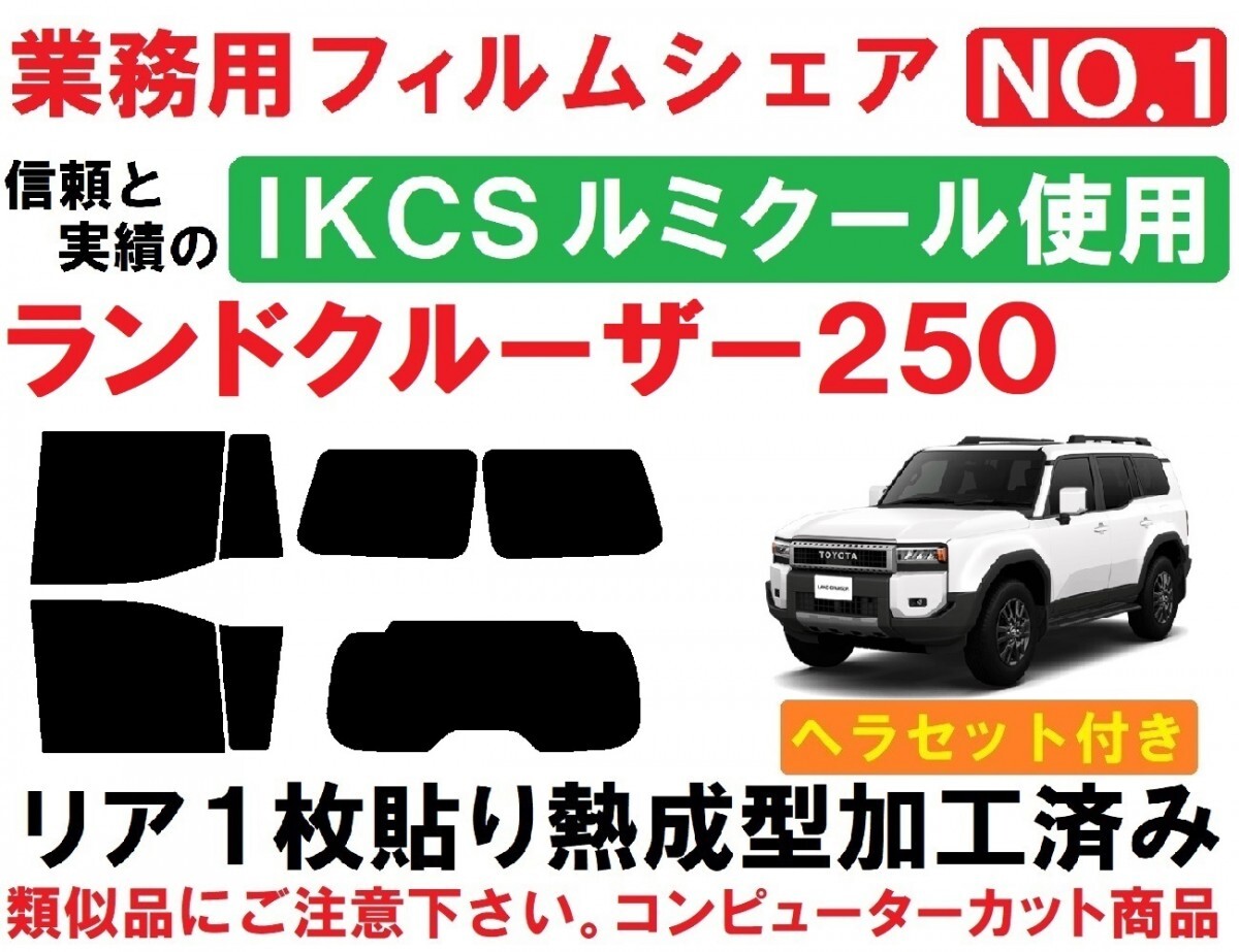 ランドクルーザー250用『IKCSルミクール使用』リア1枚貼り成型加工済みフィルムリア5面セットです。(専用施工液付き) ・信頼の品質と実績で永い間業務用フィルムとして選ばれ続けているIKCS製品です。 ・業務用フィルムの中で最も信頼性の高い、ベストセラー商品です。 ・詳しくはIKCS株式会社HPをご覧ください。 ※『ルミクール』は当店でも 施工実績・販売実績NO.1の超人気商品です。 令和6年~ ランドクルーザー250(GDJ250W/TRJ250W)に適合します。 ※適合等 ご不明な点など有りましたら、お気軽にご質問下さい。 ◇◆◇当商品には、画像2のヘラセットが付属します◇◆◇ ■滑りの良いシリコンタイプのゴムヘラ スムーズに水切り(清掃)・貼り付け後の水抜きが出来ます。 実際の業務でも色々な物を試しましたが、シンプルなこの形状・このメーカー・このグレードの物が1番使いやすいです。 柔軟性が有りガラス(フィルム)に密着するため、フィルム折れも防げます。 ■使いやすい厚みとコシの有るプラヘラ 形状は似ていても各メーカーにより硬さ・厚みなど色々と有ります。 慣れていない方でも扱い易いように少々柔らか目の物になります。 ヘラ先にはフッ素樹脂加工のクロスを貼って有りますので、滑りが良くキズを防止します。 ■ワイプオール(不織布ワイパー) 布同様の丈夫さと紙の持つ吸水性を発揮。糸くずの発生が無く均一素材のため異物混入の心配が有りません。 施工前のガラスクリーニング~施工時にフィルムが触れる可能性の有るガラスの周りのゴム部品の拭き取り清掃~吸水等に大変便利です。 全て実際の業務に使用している物で、その中から使いやすい物を選んでいます。 ヘラセットがご不用の場合、フィルムのみの商品も有ります。こちら ◇◆◇精密コンピューターカット◇◆◇ 貼りやすさを最優先に各部のサイズ・形状など微調整し、改良を重ねた独自のデータを製作。 高精度な最新・大型カッティングプロッターによるカットで正確で滑らかなカットラインを再現しています。 ※施工業者だからわかる、貼りやすいサイズ・形状に仕上げています。 ◇◆◇リア1枚貼り成型加工済み◇◆◇ リアガラスの湾曲に合わせて熱成型加工して有りますので、平面に貼るのと同様にたるみが出ず1枚貼り出来ます。 ※最適な状態に成型加工して有りますので、ヒートガン(ドライヤー)等は不要です。 ◇◆◇専用施工液付属◇◆◇ 軽視されがちな施工液ですが、貼りやすさに大きく関わる部分になります。中性洗剤などで代用せず、必ず付属の専用施工液をご使用下さい。 濃度については車種・季節などにより変わりますので、個別にお知らせ致します。 国内シェアNO.1の『IKCSルミクール』を使用しています。 ルミクールは経年退色が極めて少ない着色加工技術はもちろん、安定した冷暖房効率をアップする熱線遮断効果や断熱効果、内装を守り日焼けを防ぐため、全てのフィルムで99%の紫外線カットを実現しています。 ガラスの飛散防止効果で高い安全性を保ち、ハードコートタイプなのでキズにも強いカーフィルムです。 改良を重ねながら 信頼の品質と性能で、永い間業務用フィルムとして選ばれ続けています。 ■フィルムの種類■ 可視光線透過率 3% NS-003HC 可視光線透過率 7% NS-008HC 可視光線透過率13% NS-015HC 可視光線透過率20% NS-020HC 可視光線透過率30% NS-030HC 可視光線透過率46% NS-045HC ■全商品、キズに強いハードコート・紫外線(UV)99%カットです。 ※可視光線透過率が低くなるほどフィルムの色は濃くなります。 サイドとリアで濃さを替えたり等、可能です。 部分的にフィルムが必要になった場合、単品販売も承ります。 他にもランドクルーザー250用フィルム、各種出品中です。こちらもご覧ください。 ご不明な点など有りましたら、お気軽にご質問下さい。 | ||