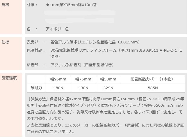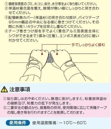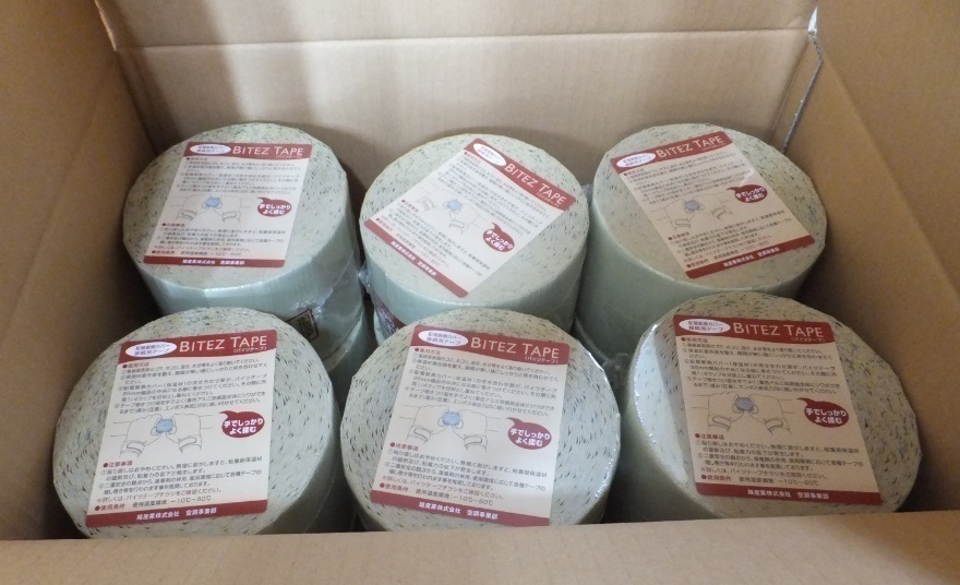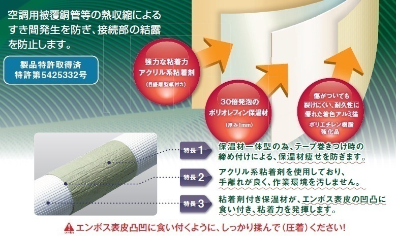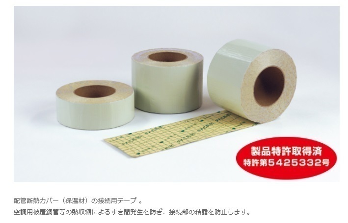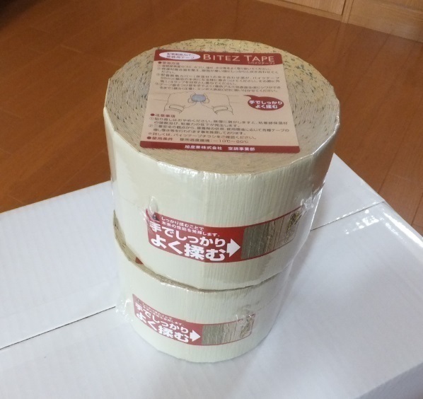| ◆空調冷媒管等の配管断熱カバー(保温材)の接続用テープ 『バイツテープ』旭産業株式会社製 1㎜厚×95㎜幅×10M長 を12巻 まとめての出品です。 オリジナル多層構造でしっかり噛み付き!強粘着ガードする。 空調用被覆銅管等の熱収縮によるすき間発生を防ぎ、接続部の結露を防止する、配管断熱カバー(保温材)の接続用テープです。 【特長】 ■強力な粘着力アクリル系粘着剤(目盛離型紙付き) ■30倍発泡のポリオレフィン保温材(厚み1mm) ■傷がついても裂けにくい ■耐久性に優れた着色アルミ箔ポリエチレン樹脂強化品 ■特許取得済み:特許第5425332号 他にも設備部材を出品しておりますよろしければマイブース覗いてください。 | |