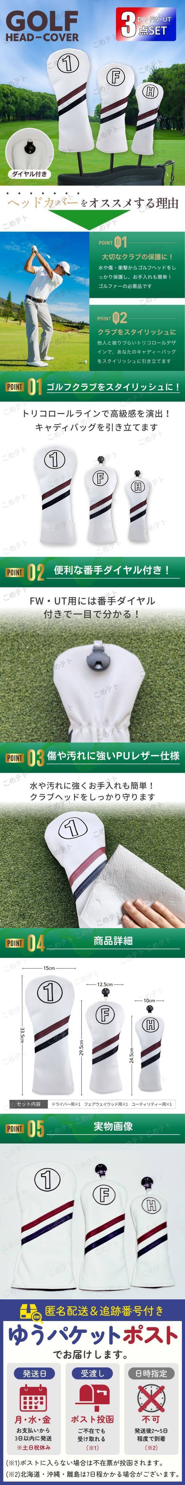 ご覧いただきありがとうございます。 【商品説明】 ■ゴルフクラブをスタイリッシュに見せるヘッドカバー3点セットです。 ドライバー・フェアウェイウッド・ユーティリティー用の3種類で、キャディバッグを引き立てます。 ■高級感のあるホワイト×トリコロールラインで上品なデザインに! シンプルながらも存在感があり、性別や年齢を問わず、キャディーバッグにも合います。 ■水や汚れに強いPUレザーを使用 PUレザーを使用することで、水や汚れから守り、お手入れも簡単です。 内側は柔らかい起毛になっており、クラブヘッドをキズや衝撃からしっかり守ります。 ■フェアウェイウッド用・ユーティリティ用には番手表示ダイアル付き! ・FW番手ダイアル(2 3 4 5 6 7 X)が選択できます。 ・UT番手(2 3 4 5 6 7 X)が選択できます。 【商品詳細】 ■サイズ ・ドライバー(1) 約33㎝×約12㎝ 重さ 約98g ・フェアウェイウッド(F) 約28.5㎝×約11㎝ 重さ 約81g ・ユーティリティ(H) 約24.5㎝×約9㎝ 重さ 約53g 素材:PUレザー セット内容:3点セット 【お支払い方法】 ・!かんたん決済 【発送について】 ・おてがる配送(日本郵便)で発送します 発送日 :お支払い後1~3日以内 到着目安:発送後2~5日程度 ※商品はポストに投函されます ※遠方の方はもう少しかかる場合もございます ◎注意事項 ・落札後は期限内にお支払いください ・商品画像の転載や説明文のコピーはお止め下さい ◎初期不良は対応しますので、何かあれば「評価前に」ご連絡下さい |