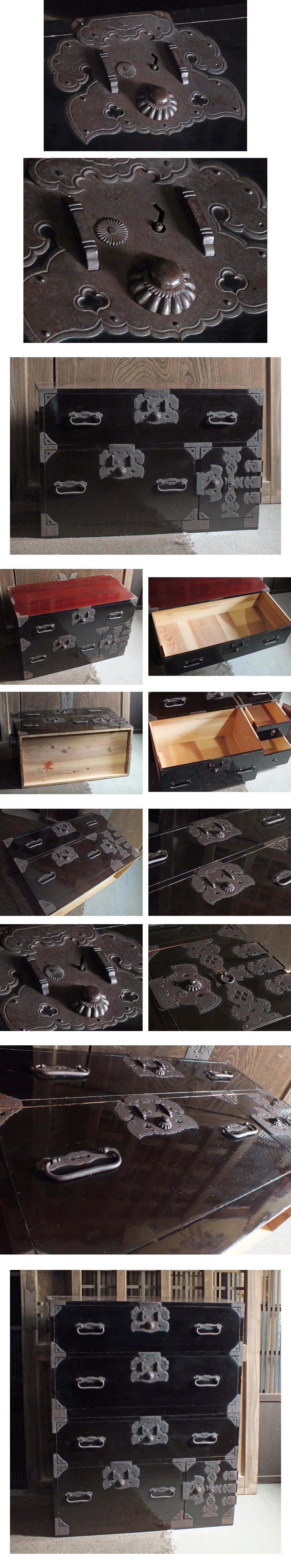 船箪笥の三大産地、江戸期から商業漁港で栄えた北前船の寄港地、酒田にて明治~大正期頃に造られた物で、前面に黒塗りが施され、側は錆朱に塗られた箪笥です。