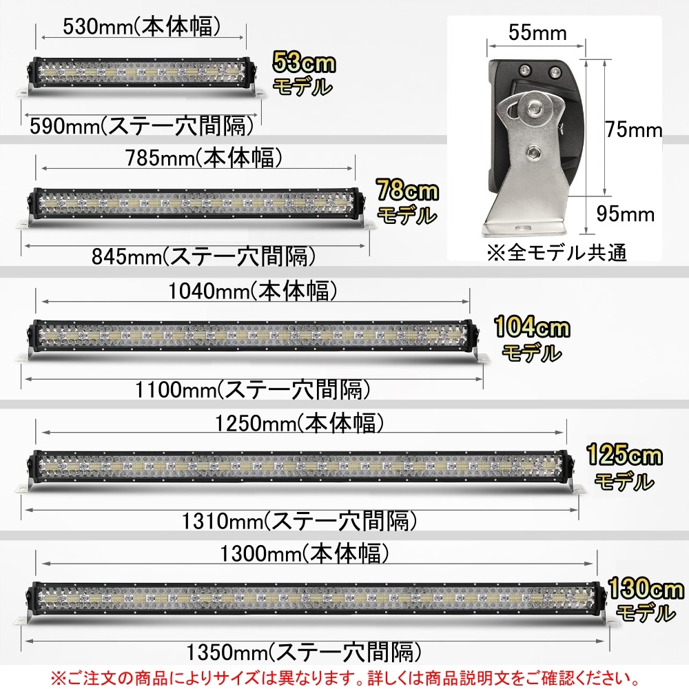 | 商品内容 LEDライトバー(130cm) ストレートタイプ 特徴 発光色:ホワイト 対応電圧:12V/24V 消費電力:975W 色温度:6,500K 防水・防塵性能:IP68 (防水/防塵ともに最高性能) 動作温度:-40℃~85℃ 動作寿命:50,000時間以上 全体サイズ:1,350mm 照明部サイズ:1,300mm 付属品:固定用ステー/配線 適合確認 タイトルの車種情報をご確認ください。 ※タイトルにある車種以外でも12V/24V車であればご使用可能です。 ※タイトル車種は弊社で12V及び24Vであることを確認した車種になります。 |