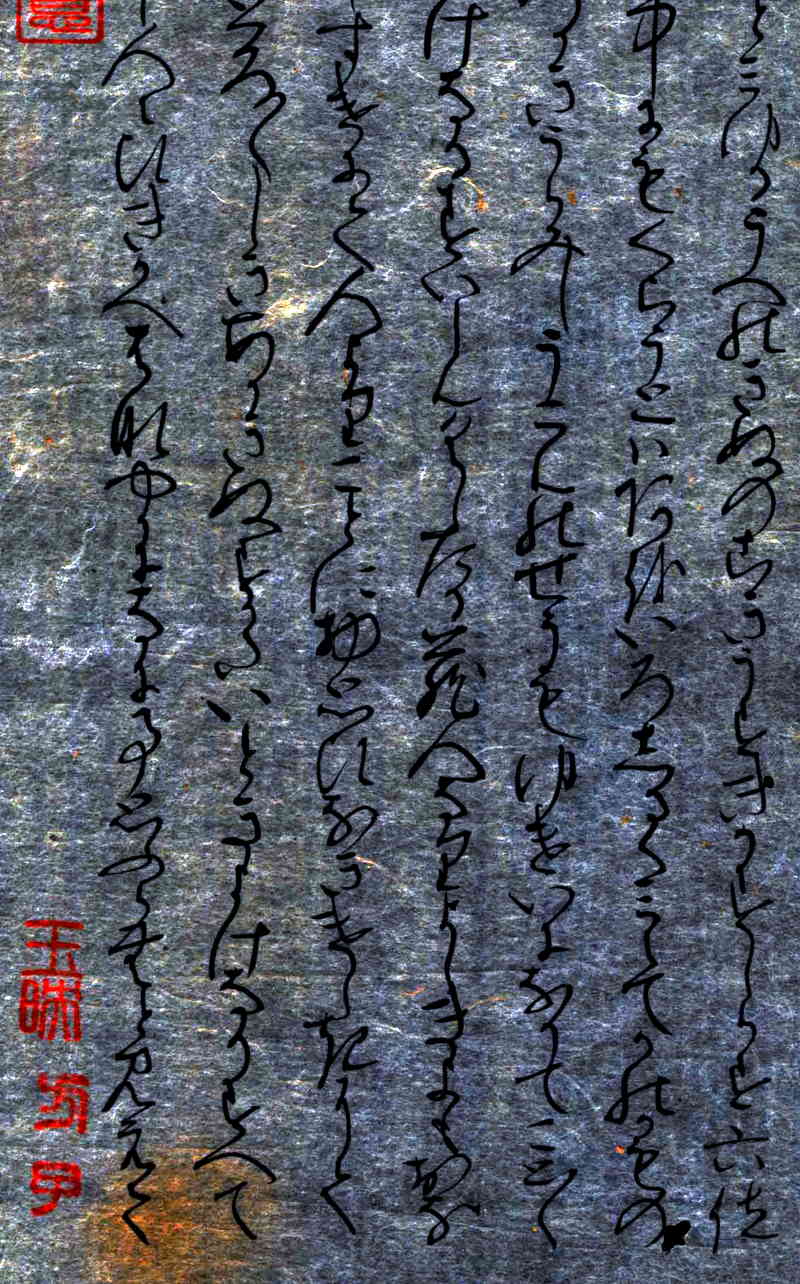 自筆の稀少価値は、和紙の生成技法の緻密さにあります。上の「拡大断層(MRI)写真」でわかる通り、極めて薄い和紙の上に墨の文字がくっきりと浮き上がるように「源氏物語」の文字が記されております。 出品している書の「断層(MRI)写真」の原板は、レントゲン写真と同じ新聞の半分ほどの大きさのフィルムです。肉眼では見ることのできない和紙の繊維の一本一本のミクロの世界を見ることができます。日本国内では医療用以外には見ることのできない書の「断層(MRI)写真」です。 古切の書は、一旦表装を剥離し分析と鑑定検査のために「断層(MRI)写真撮影」をしております。撮影後、展示のために再表装をしております。掛軸や屏風にすることが可能なように、「Removable Paste(再剥離用糊)」を使用しているため、自筆の書に影響をあたえずに、容易に「剥離」することができるような特殊な表装となっております。 |