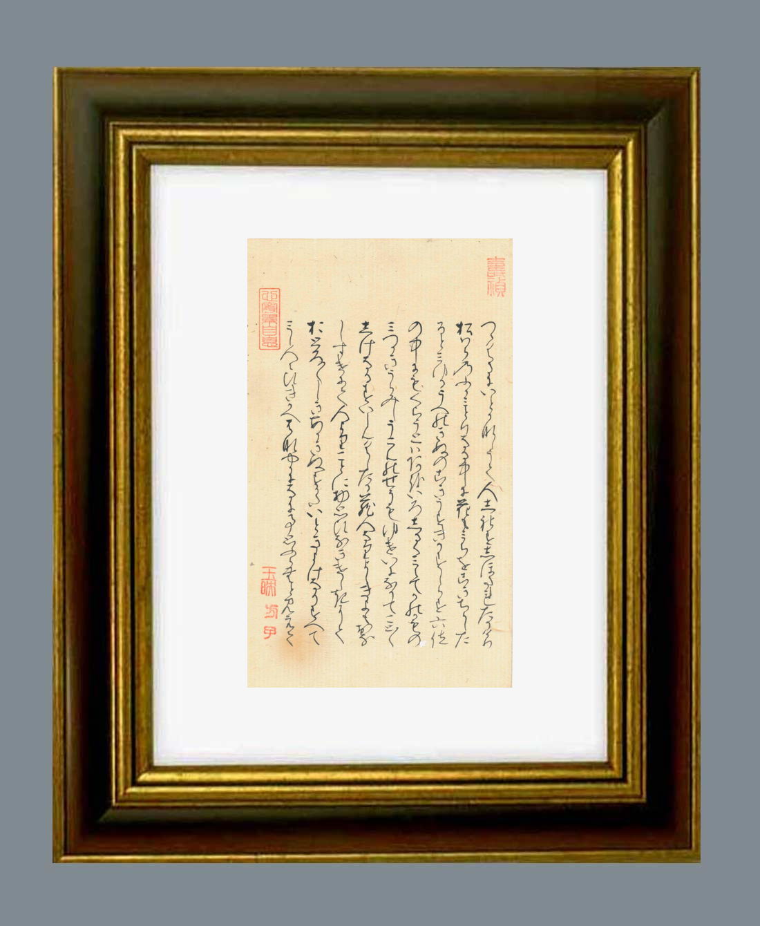 「源氏物語」自筆の大きさ タテ21.8センチ ヨコ12.8センチ。額縁の大きさは タテ37.0センチ ヨコ28.0センチです。額縁は新品です。 |