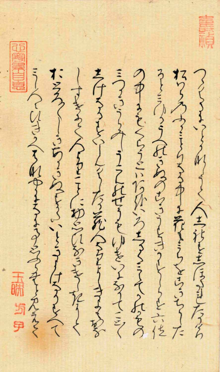 原文上部には「心寧累自息」《心寧(やす)ければ累(るい)も自(おのずか)ら息(や)む》という漢文の篆書印が押捺されている。言葉の意味は、「心安らかならば煩(わずら)いも自然に消える」である。