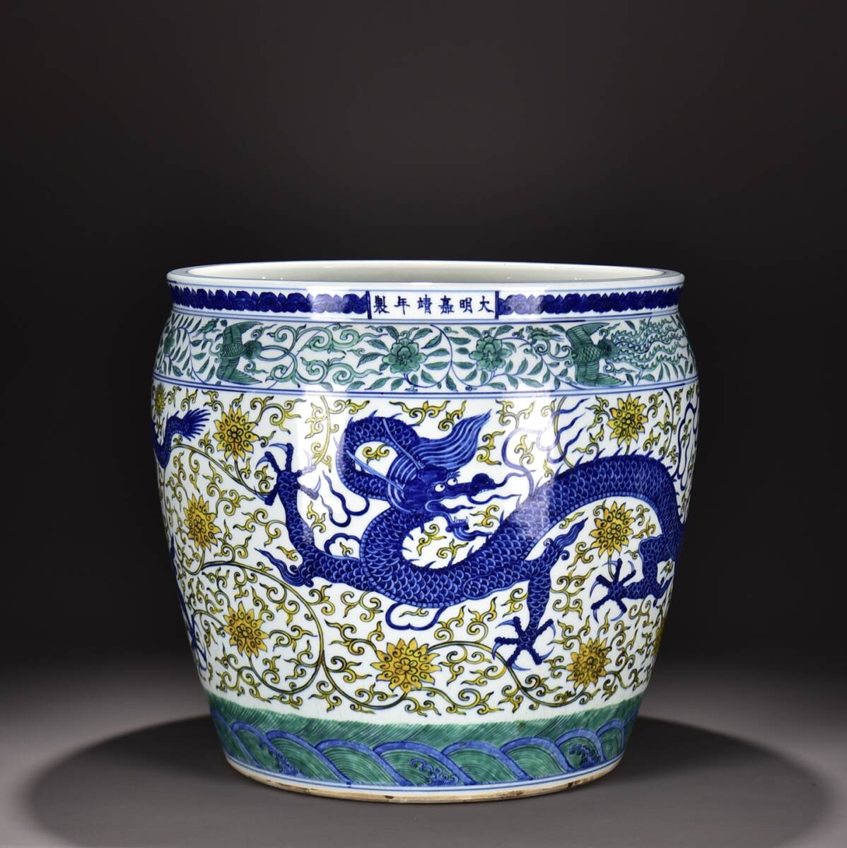 中国磁器 陶芸 磁器『明嘉靖素三彩纏枝花卉竜紋大甕』施釉陶 古代工芸品 陶芸 精美彫 置物 收藏品 | |||
