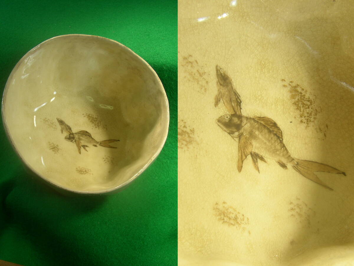 「見込み」には「金彩」を散らし「二匹」の「魚」を配した、見栄えする豪華な出来栄えの「茶碗」であり「色合い・陶質」も良く見事です。