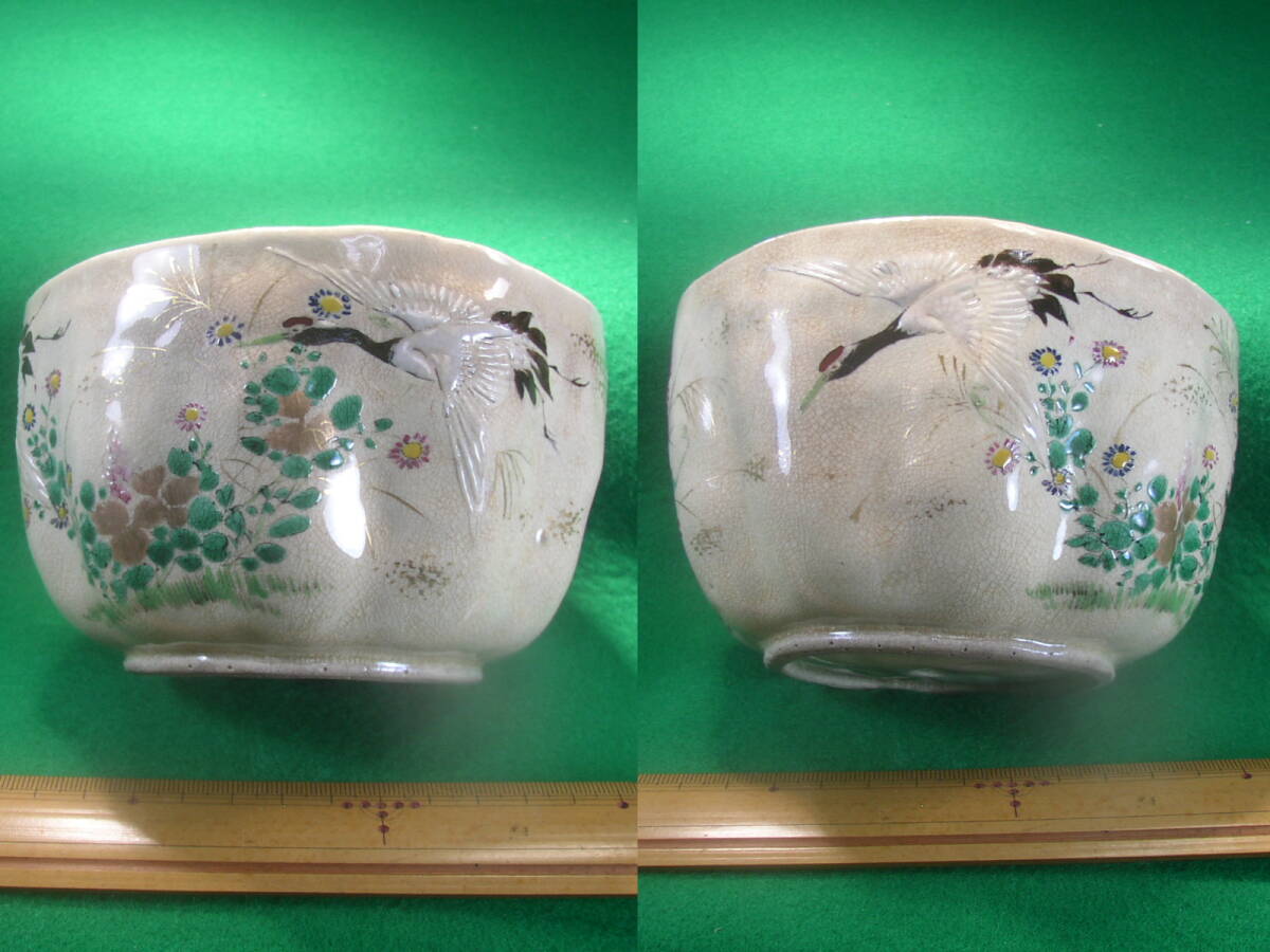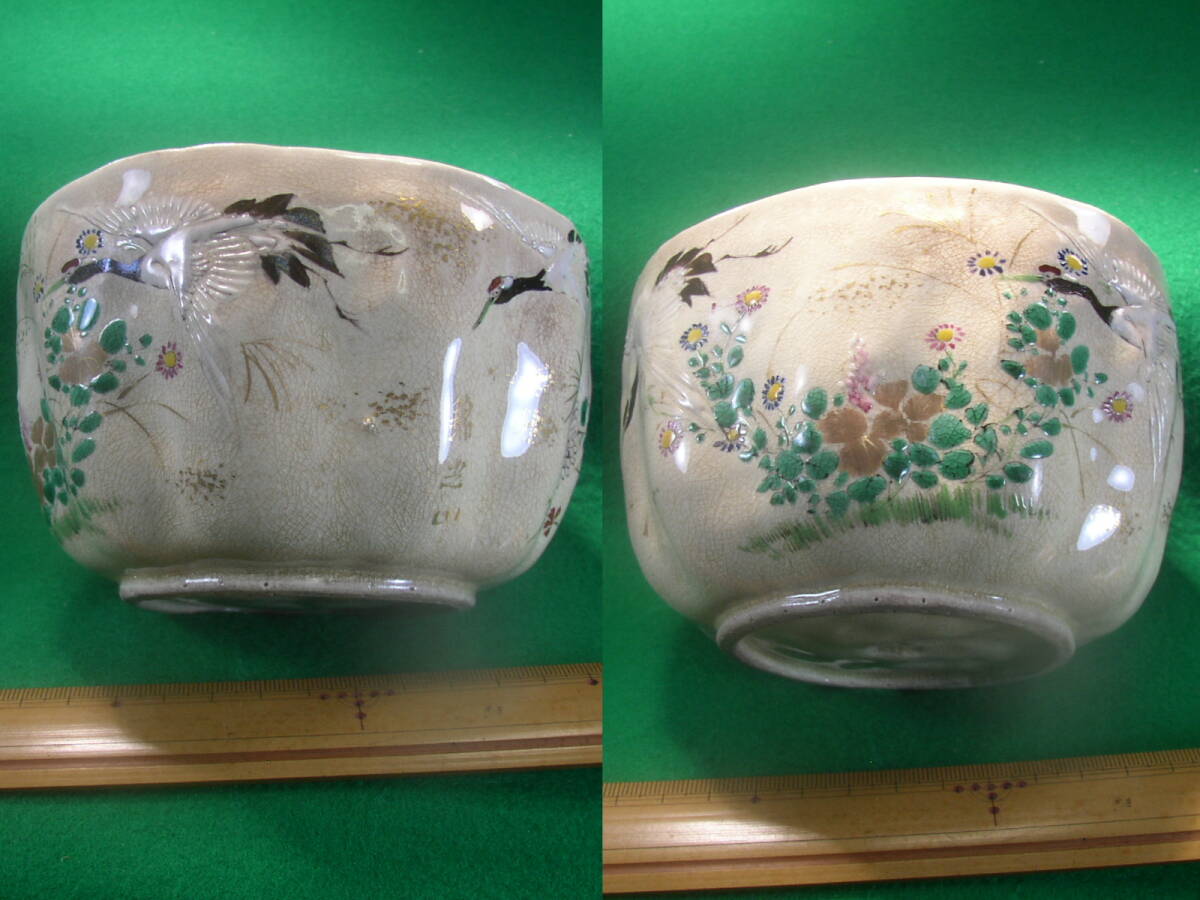 茶碗 鶴に秋草の図.六代(七代)錦光山宗兵衛.桐箱入.金銀彩色絵.絢爛豪華也.100年以上の時代物・仁清風色絵清水焼.粟田焼.京焼. この度の「鶴に秋草の図」の「茶碗」は明治から大正頃の「六代(七代)錦光山宗兵衛」の作陶と思われる「茶碗」で胴下部に「錦光山」と「金彩」で高台に「錦光山」と「陶印」のあります。