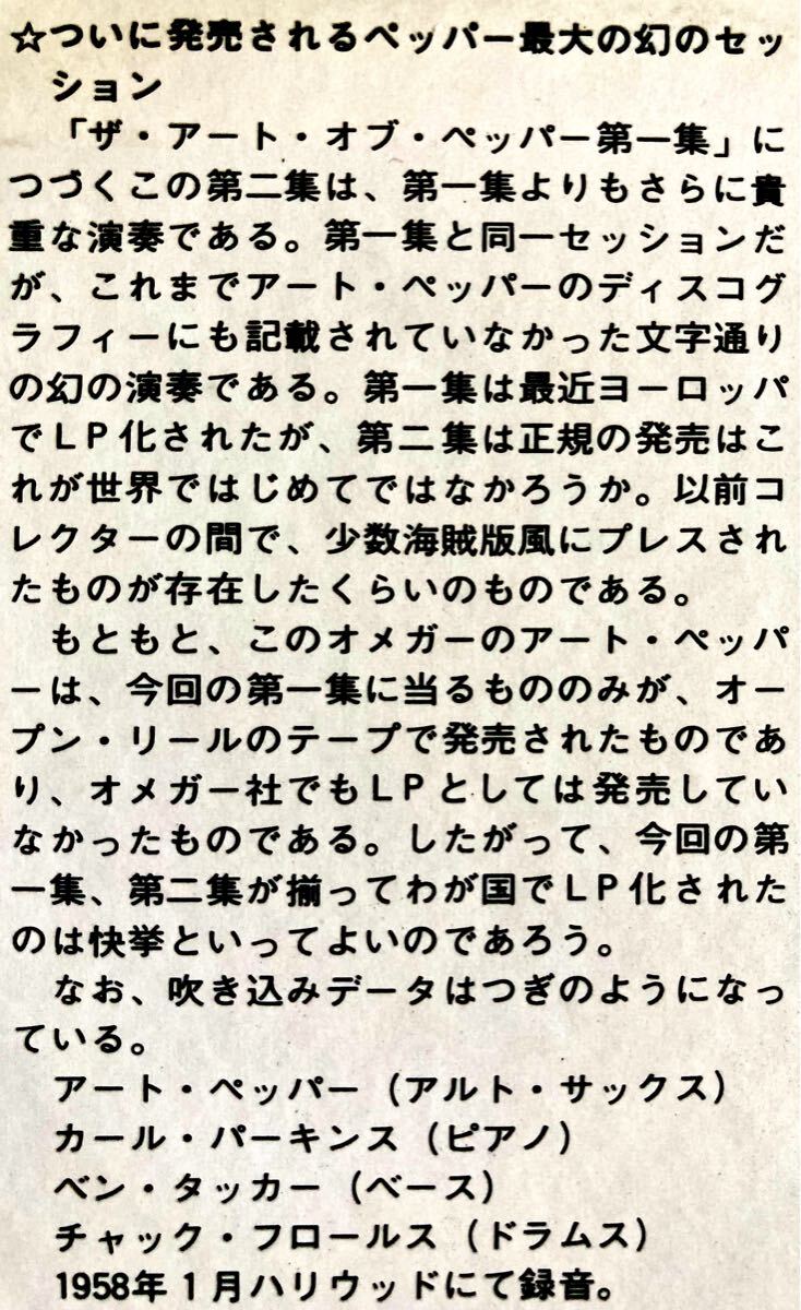 ★★★ご覧いただき、ありがとうございます。 当方の出品しております商品は全て即決価格で出品しております。 ご入札されますと、その価格ですぐに落札となりますように設定しております。 ご希望の商品がございましたら、お気軽にご入札、落札してください★★★ 【ビバップ・アルト・サックス名手アート・ペッパー/ザ・アート・オブ・ペッパー第2集〜ビバップ・ピアノ名手カール・パーキンス・トリオ〜ベン・タッカー&チャック・フローレス〜瑞々しく冴え渡る50年代アート・ペッパー魅力伝える快演名作1958年】 きれいな盤状態です。 発送は定形外郵便でレコード1枚、660円で発送いたします。見開きジャケット、2枚組LPは920円で発送いたします。 |