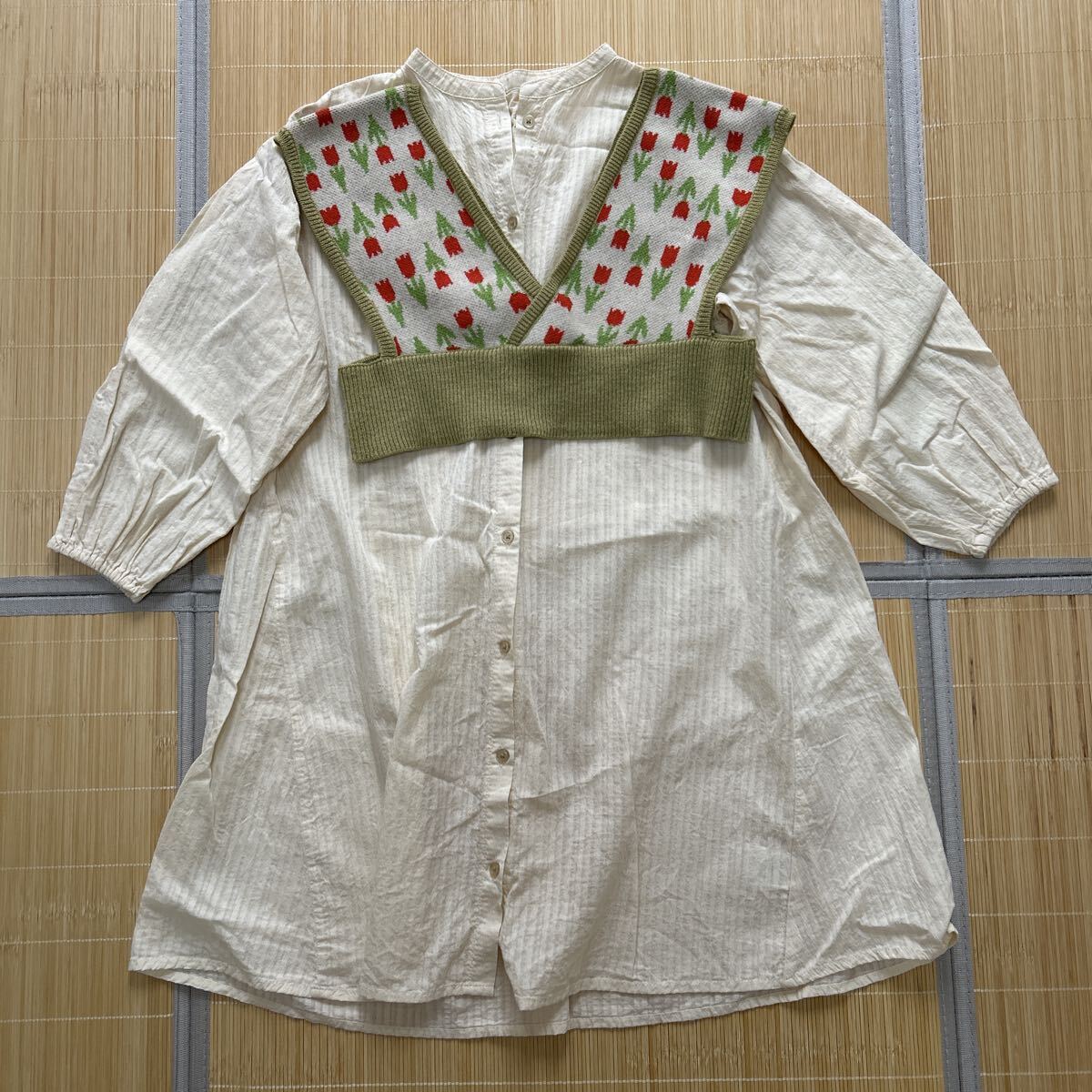 アデリアレトロのチューリップ柄のシャツワンピース、毛糸のベスト付きです。サイズは130です。130ですが大きめ、ゆったり目なので150サイズぐらいの体形まで着れそうです。usedですが、美品です!!!シャツとしてもワンピース単品としても、何通りでも着れます!ブリーズで購入しました。