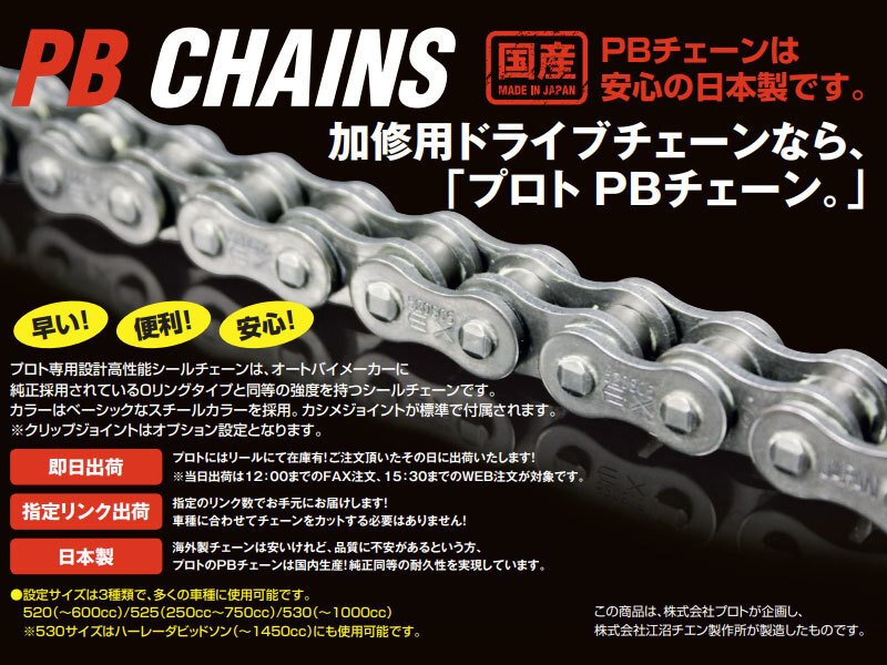 | ●チェーンサイズ:520(-600cc規格)/リンク数:110L ●株式会社プロトが企画し、株式会社江沼チエン製作所が製造。純正に採用されているチェーンと同等の品質。 ●国産品!生産と加工を全て国内で行い、純正同等の耐久性を実現。安価な海外製が不安な方にオススメ。 ●オーソドックスなOリングチェーンで材質はスチールのみ、パッケージをダンボールにする事でコスト削減。 ●指定リンク数でカット済み。車種に合わせてカットする必要はありません。 ●本体はベーシックなスチールカラー(無地)のみ。カシメ式ジョイントが付属します。 ●商品内容:ドライブチェーン(Oリングチェーン)、チェーンジョイント(要かしめ工具)、取扱説明書 ●適合情報は純正データに基づいて設定されております。現車をよく確認頂きますようお願いします ●指定サイズでの受注品のため発注後のキャンセル、お届け後の返品/交換は不可となります。 |