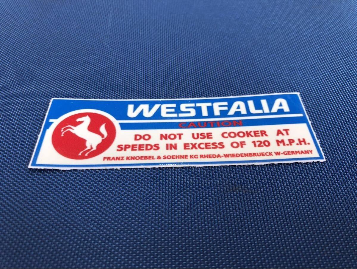 ウエストファリア CAUTION ステッカーです。内容は ”注意 120MPHを超える速度で調理器具を使用しないで下さい” と書かれています。サイズは95mm x 30mmです。発送は85円にてお送りします。