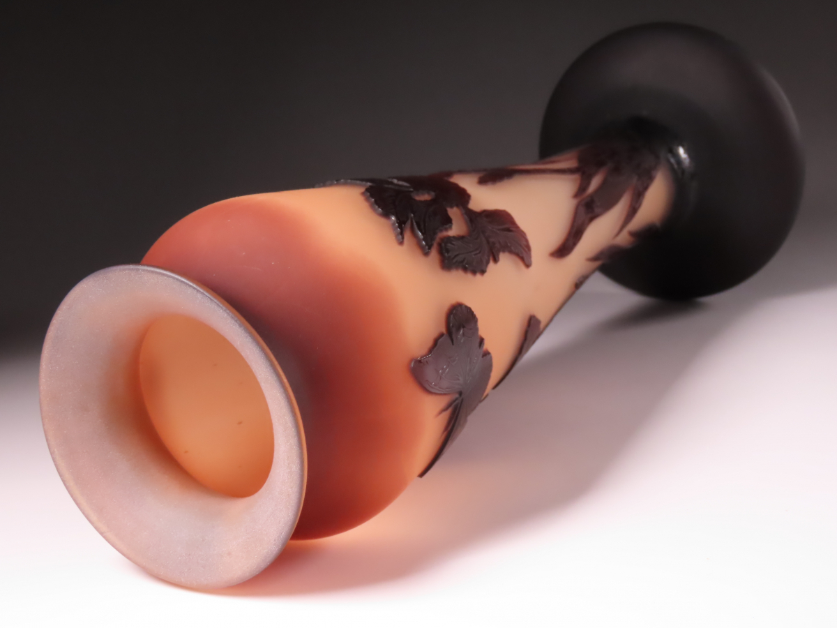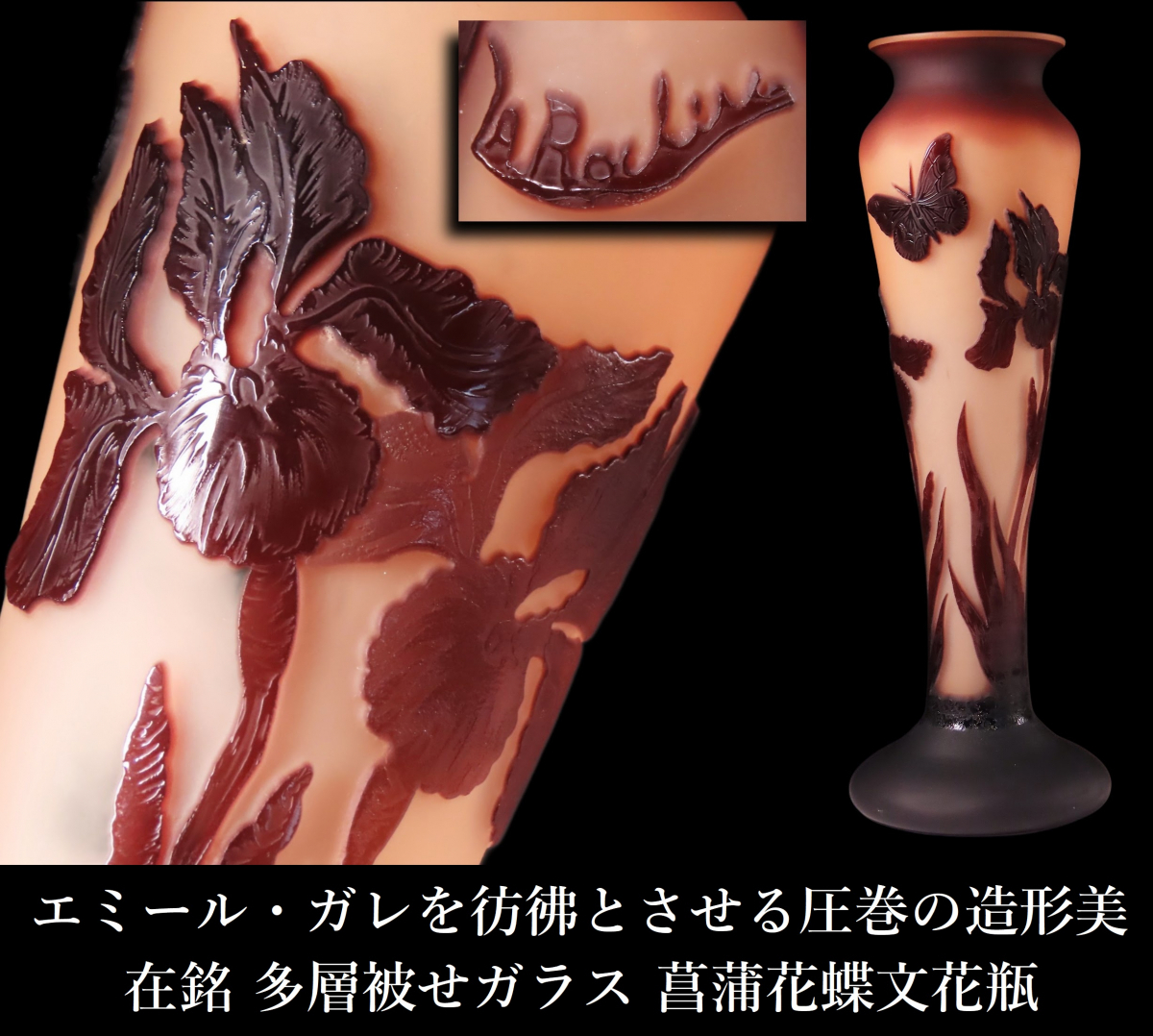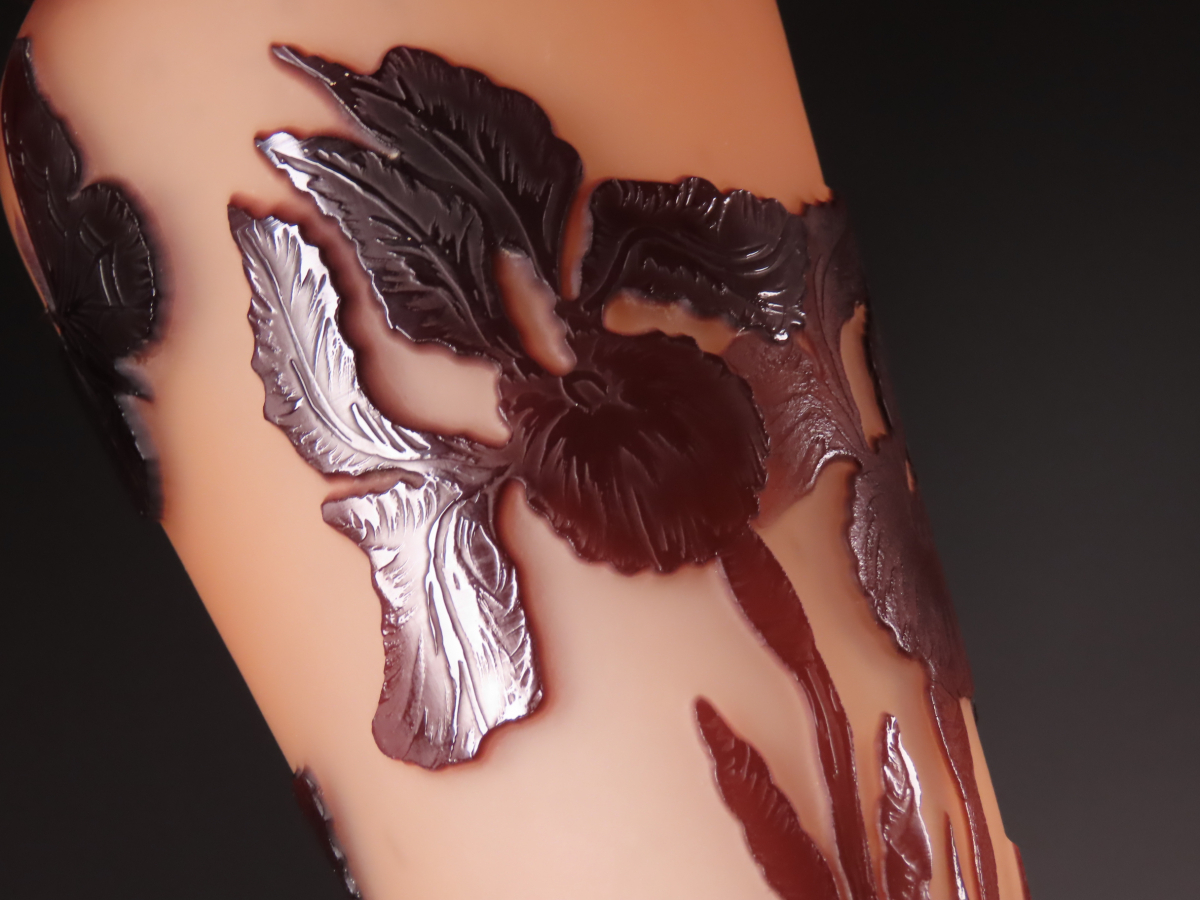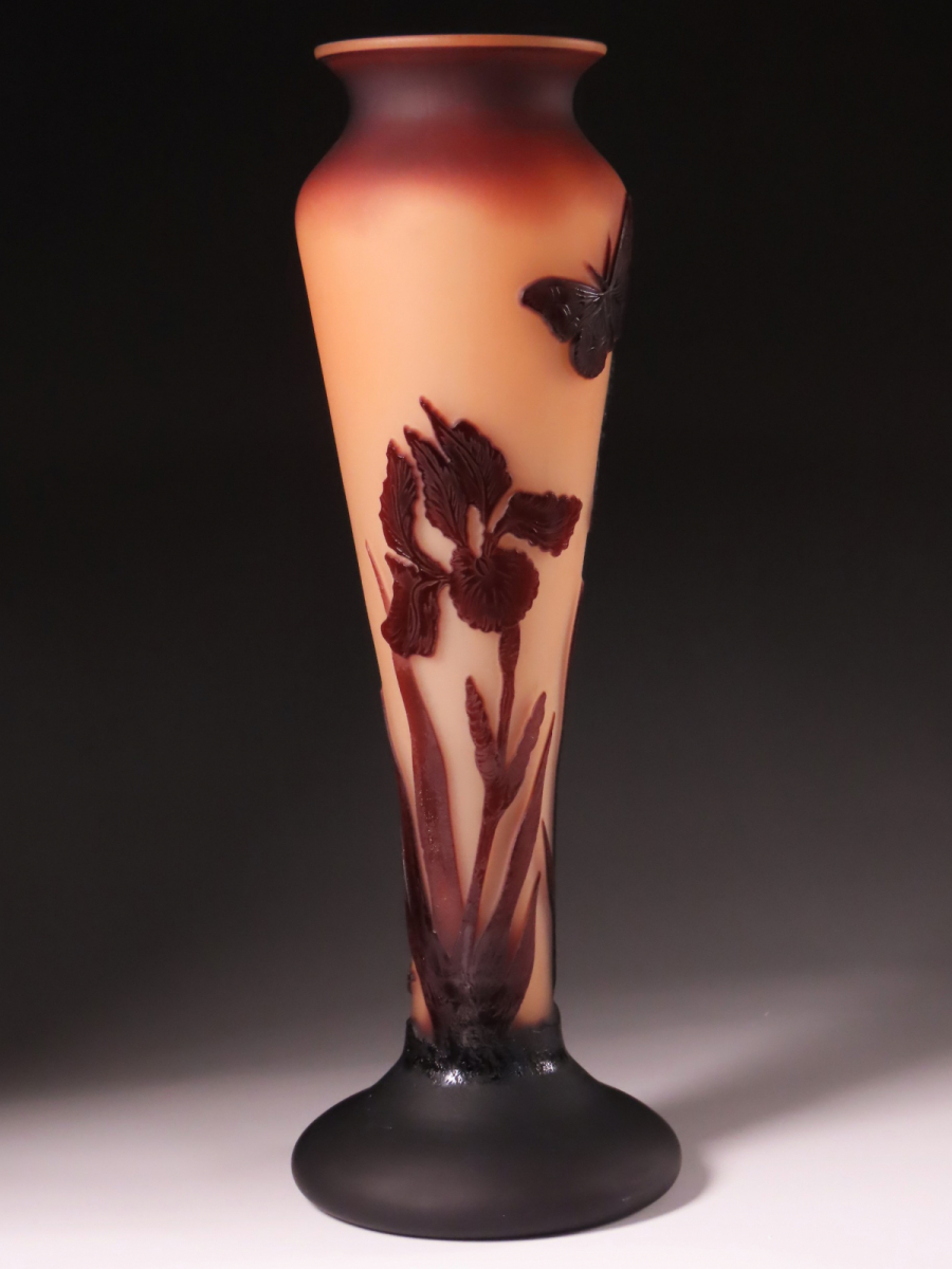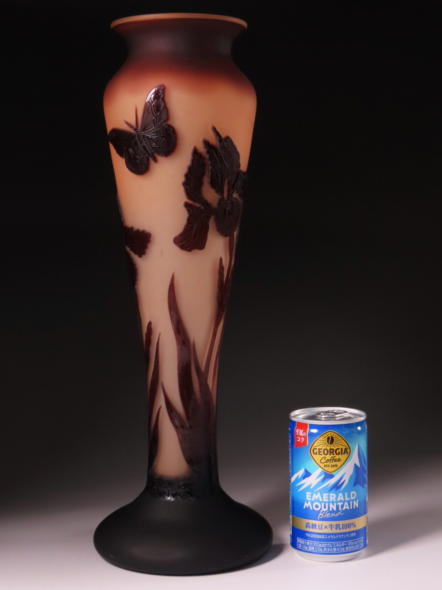 【ONE'S】エミール・ガレを彷彿とさせる圧巻の造形美 在銘 多層被せガラス 菖蒲花蝶文花瓶 フラワーベース 飾壷 高35.8cm 西洋美術 | |||