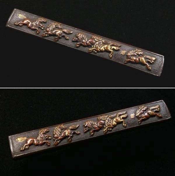 | 商品説明 | ~寸法~ 約 9.64cm× 約 1.43cm 力強き高彫細工により 躍動感ある馬の群れが細工された 見応えある一品です。 作行から見て後藤系統の優品と推測しております。 詳しくは画像にてご確認下さい。 大切にして頂ける方の元へ届けば幸いでございます。 ~状態~ 全体的に見て状態は概ね良好です。 画像にてご確認下さい。 許容範囲内の時代傷みはご理解下さい。 |
