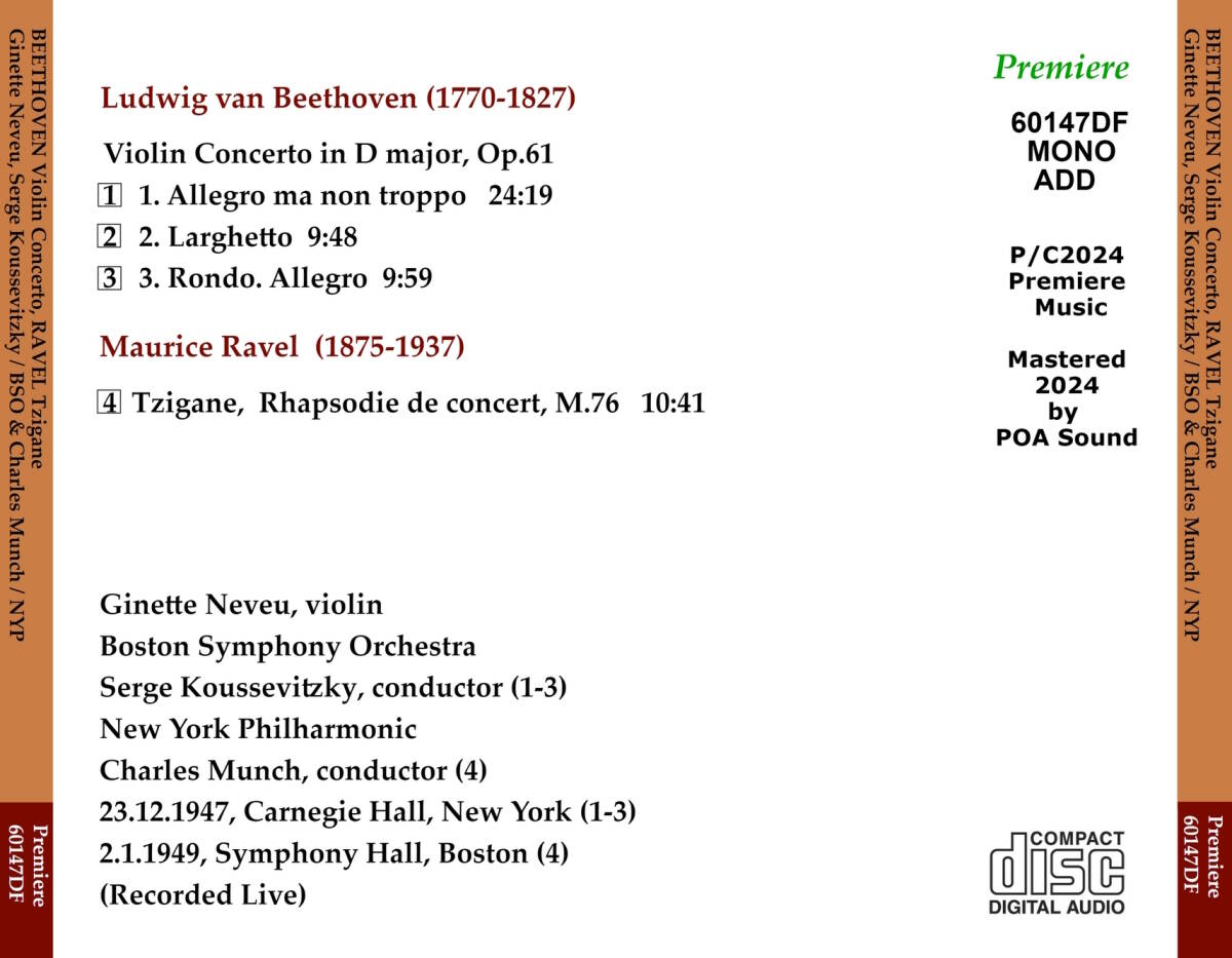 【CD-R盤】 ベートーヴェン/ヴァイオリン協奏曲 ニ長調 OP.61 ラヴェル/ツィガーヌ * ジネット・ヌヴー(Vn) セルゲイ・クーセヴィツキー指揮 ボストン交響楽団 *シャルル・ミュンシュ指揮 ニューヨーク・フィルハーモニック 1947年12月23日, ボストン・シンフォニー・ホール, 1949.1.2, カーネギー・ホール ライヴ録音(MONO) 航空機事故により惜しくも早世した名手ジネット・ヌヴーによるアメリカ公演ライヴ。 アメリカ人コレクターからの提供音源で、2曲とも音質がそれなりに良好で安定しているため、エアチェックではなく放送局保管音源のコピーと思われる。 1947年のベートーヴェンは連続20分程度録音可能なアセテートディスクによる収録。ディスク録音特有のスクラッチノイズはあったものの、ソフトな音質のノイズで容易に低減・除去しやすいタイプ。周波数レンジも比較的広かった。しかし低域過剰・高域不足でバランスが悪く、全体にくすんだ音質で演奏が貧相・地味に聴こえる。ソロヴァイオリンも音量レベルが極端に低く聴き取れない箇所もあった。 CD化に当たって、スクラッチノイズについてはソフトウェアにより音質を損ねることなく大半を除去。周波数バランスをイコライジング等で調整、周波数レンジも20kHz程度まで仮想的に拡大。また、ソロヴァイオリンの音量レベルが低い箇所は適度に調整(ただし、こちらはヌヴーが強弱を意図的にコントロールしている可能性があるため控えめに処理)等を行った結果、1950年代半ばのモノラルLP程度まで音質が改善され、ヌヴーのヴァイオリンも輝きが増し、演奏の印象も一変した。 一方、1949年のラヴェルはテープによる録音。 前年1948年にアンペックスから商用テープレコーダーが発売されており、早速導入したのだろう。1947年のベートーヴェンと比べると音質は格段に良く、フォーマットによる差は大きい。 但しこちらは逆に高域過剰・低域不足でバランスが悪かった。シャルル・ミュンシュの演奏(オーケストラ・バランス)自体がやや腰高な傾向があることは事実だが、これは極端過ぎる。 CD化に当たっては、ベートーヴェンと同様に周波数バランスを調整、周波数レンジも20kHz程度まで仮想的に拡大することにより、こちらも不満なく鑑賞出来る音質とすることが出来た。 ジネット・ヌヴーは1937年に初めてアメリカ公演を行い、第二次世界大戦による中断の後、1947年に二度目のアメリカ公演を行った。 1947年の公演は、すでにヨーロッパにおける名声が大西洋を越えて届いていたこともあり、アメリカのみならず南米も含む大規模な2ヶ月間のツアーであった。 当録音に聴くボストン響(BSO)との共演前の11月13・14日、ミュンシュ指揮ニューヨーク・フィル(NYP)とブラームスのヴァイオリン協奏曲を演奏しデビューを飾った。この公演について作曲家・評論家のヴァージル・トムソンは、「(ヌヴーは)若いヨーロッパのアーティストの中で、あらゆる観点から見て最高の存在。彼女は独自のリズムと激しさを持っており、興味深いアーティスト」と批評、ピアニスト・評論家のロバート・ベーガーはニューヨーク・ワールド・テレグラム紙に「内面性、熱情、力強さ、抒情性、音楽的知性の多くを備えたパリジェンヌ。背が高く、黒髪で威厳のある風貌。ローブをまとった従者のようで見る者を魅了する」と絶賛するなど、アメリカにおけるヌヴーの評価を絶対的なものとした。 当録音に聴く12月23日のBSO との共演は10月24・25日のBSO 定期演奏会に次ぐもので、これは元楽団員やその家族のための年金基金演奏会(pension concert)として実施された1回のみの公演。 プログラムはすべてベートーヴェン作品で前半に交響曲第7番、休憩を挟んでコリオラン序曲、最後にヴァイオリン協奏曲となっており明らかにヌヴーが中心の構成。当時の人気と評価の高さが窺える。ちなみにクーセヴィツキーはヌヴーとの共演後、「これほどの演奏は今後聴けないだろう」と語ったという。 ここで興味深いのは、10月24・25日のBSO 定期演奏会とはヌヴーの「待遇」が異なること。10月の演奏会は、指揮は副指揮者のリチャード・バージン(バーギン)、プログラムは、冒頭にヘンリー・カウエルの交響曲第4番(世界初演)、続いてヌヴーの独奏でブラームスのヴァイオリン協奏曲、休憩を挟んでヒンデミットのシンフォニア・セレーナというもの。ブラームス以外は新作初演と渋い作品が並び、副指揮者が担当するという、ヌヴーのBSO デビュー公演としては少々地味な印象。アメリカのメジャー・オーケストラは前年シーズン中に翌シーズンの詳細なプログラムを決定するから、オーケストラ側がヌヴーの評価を留保したり、12月の年金基金演奏会で急遽プログラムを変更したり、クーセヴィツキーが指揮台に上ったということは考えられず、どのような理由で10月のプログラムが組まれたのか知りたいところだ。 因みにここで聴くヌヴーのベートーヴェンは、マイク・セッティングの影響もあると思われる