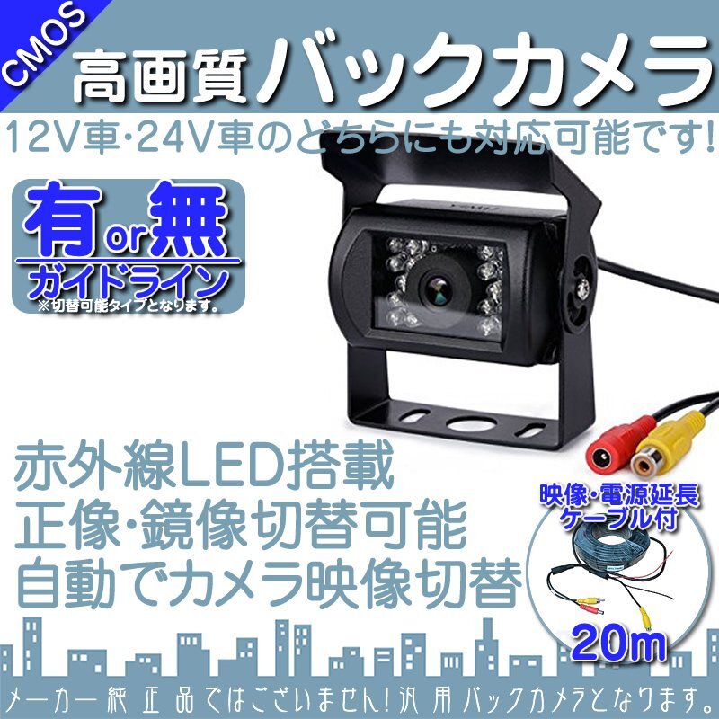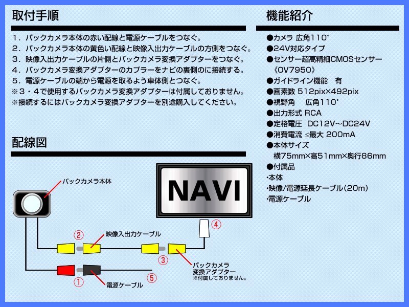 | 外観:角型 固定方法:ネジ固定 センサー:CCD 画素数:720pix×480pix(34万画素) 視野角:水平 95° / 垂直 68 °/ 対角 144° 出力映像:鏡像 ガイドライン:有or無し※初期設定は、ガイドライン有 防水防塵性能:IP67 映像出力端子:RCA 定格電圧:DC12V/DC24V 消費電流:60mA 消費電流(赤外線作動時):300mA 本体サイズ(最大):横 70mm × 高 40mm × 奥行 50mm 電源ケーブルの長さ:約100cm 映像ケーブル長さ:約20m |