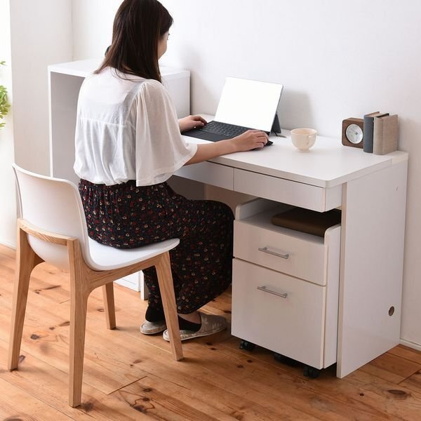| シンプルなデスクにチェストが付いたセットアイテム。 デスクの足元には配線が収納できるスペースがあり、パソコンなどの充電コードが邪魔になりません。 幅100cm、奥行45cmのコンパクトなデザインは、 書斎でもリビングでも置き場所に困らずご使用いただけます。 |