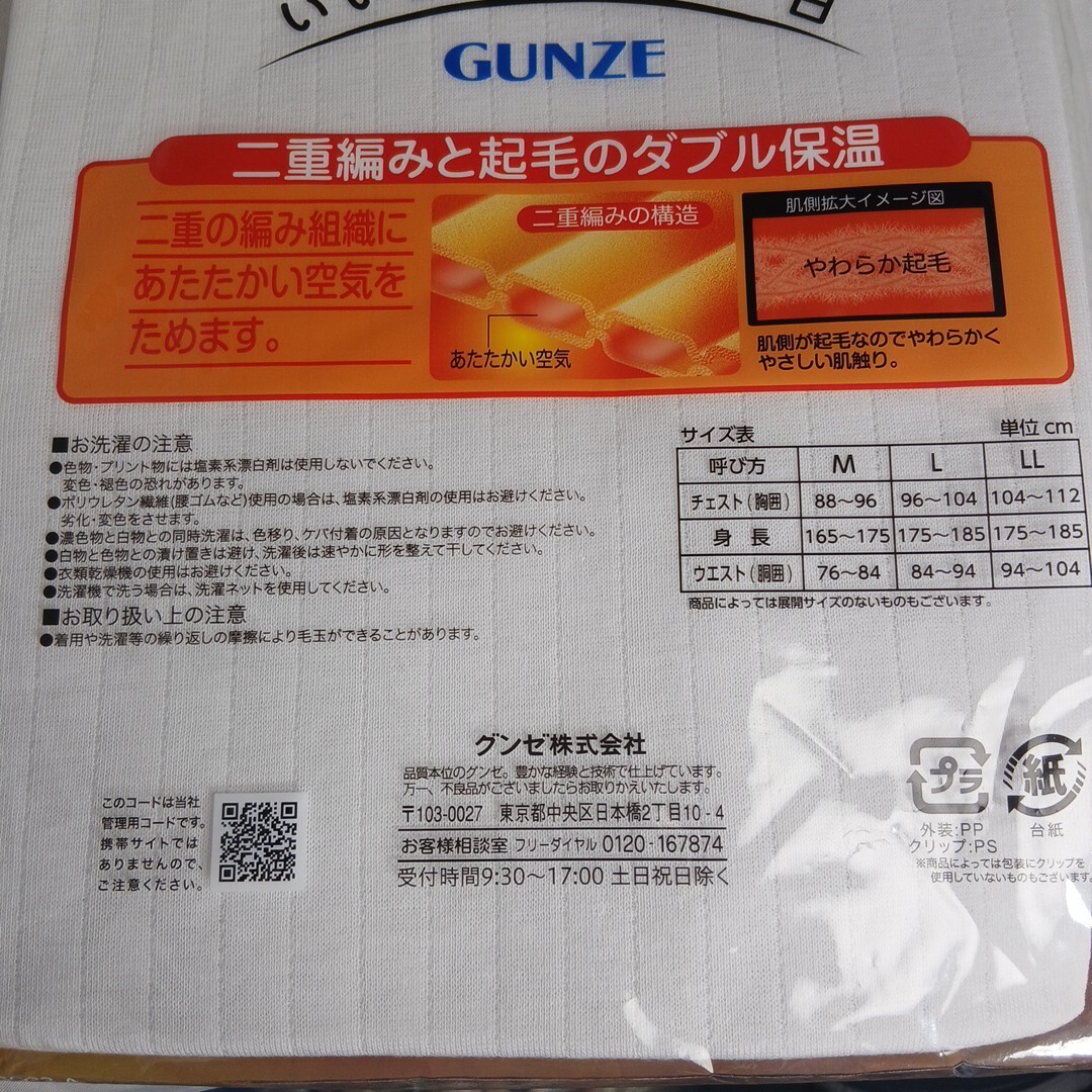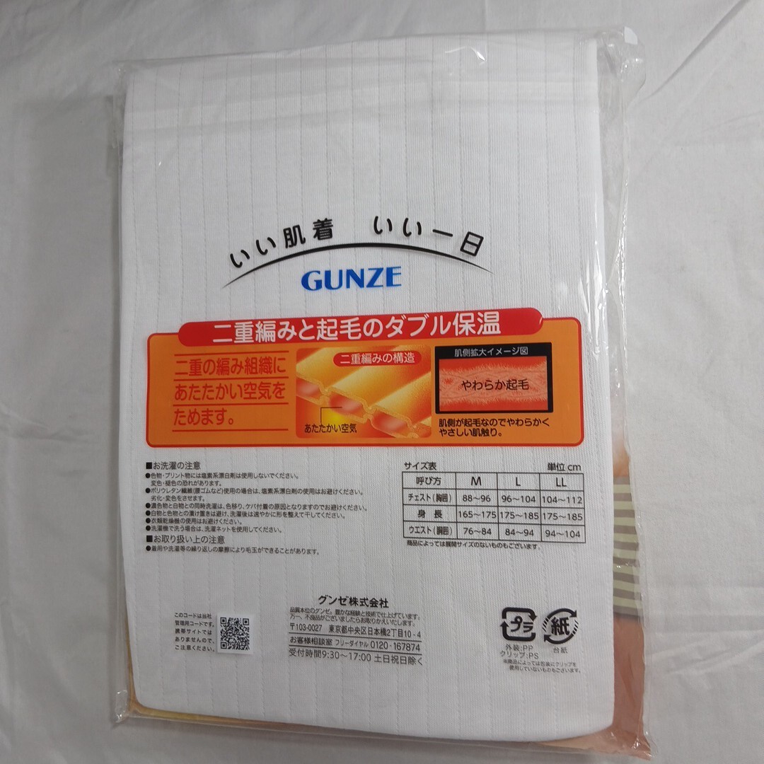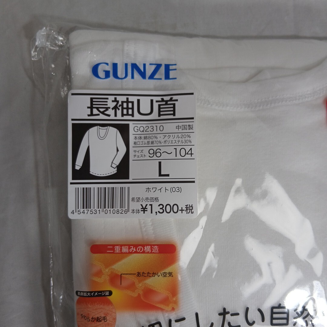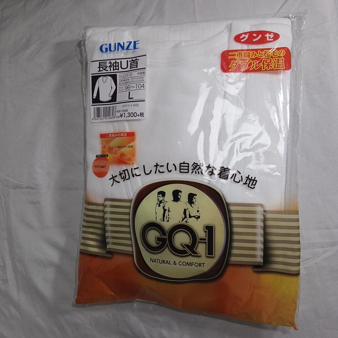 グンゼのGQ-1の長袖U 首です。サイズはLで、チェスト96~104センチです。素材は、本体が綿80%、アクリル20%で、袖口ゴム部が綿70%、ポリエステル30%です。色は、白色です。未使用ですが自宅保管品です。
