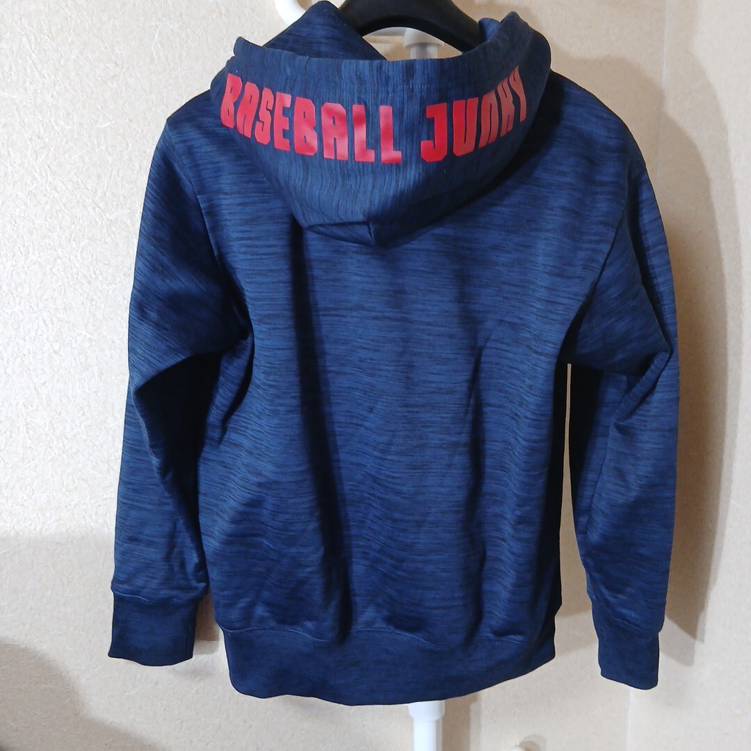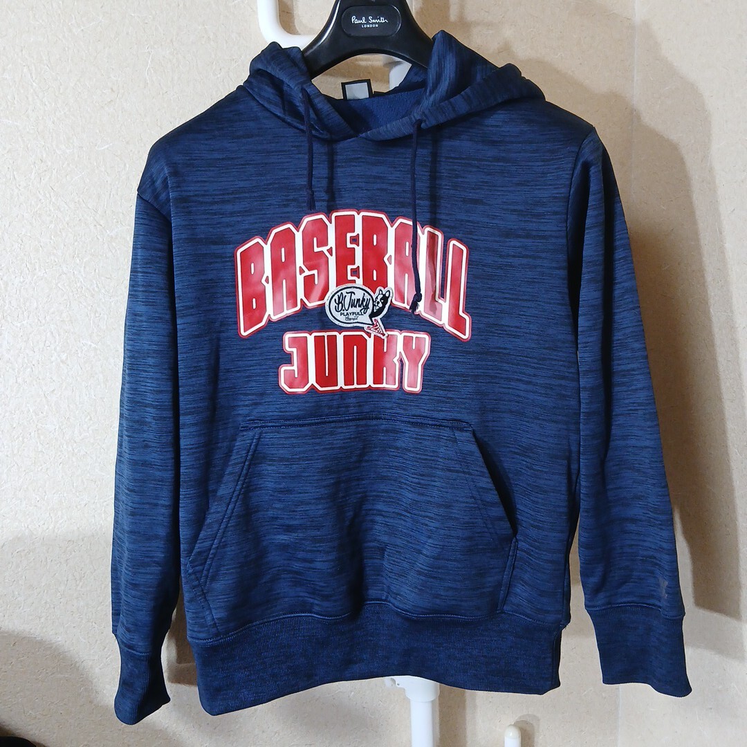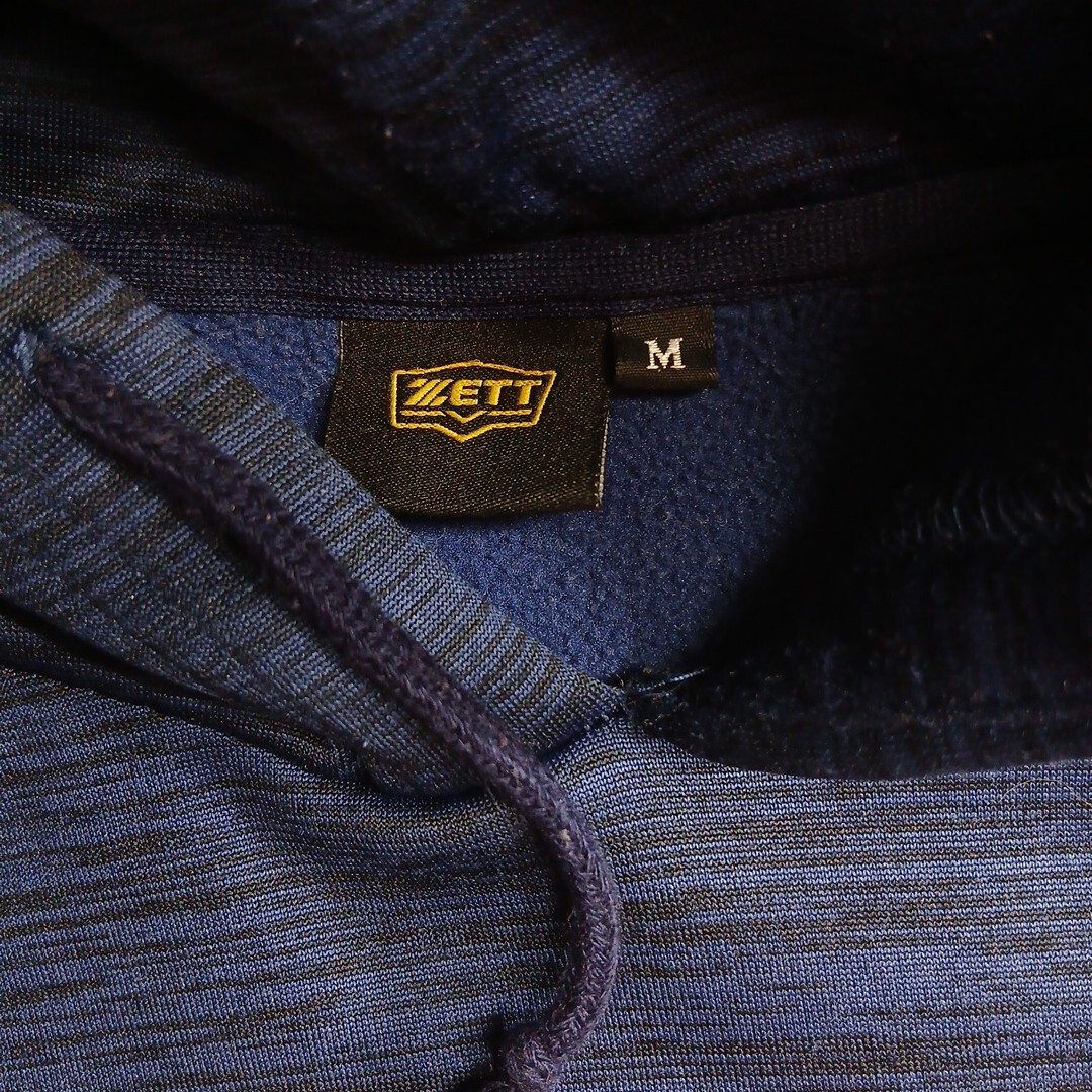 ゼットのベースボールジャンキーのパーカーです。サイズはMで、実寸でおおよそ肩幅49センチ、身幅49センチ、着丈63センチ、袖丈56センチです。素材は、ポリエステル100%です。色は、青色です。多少使用感などございますが特に目立つキズや汚れは無いと思います。