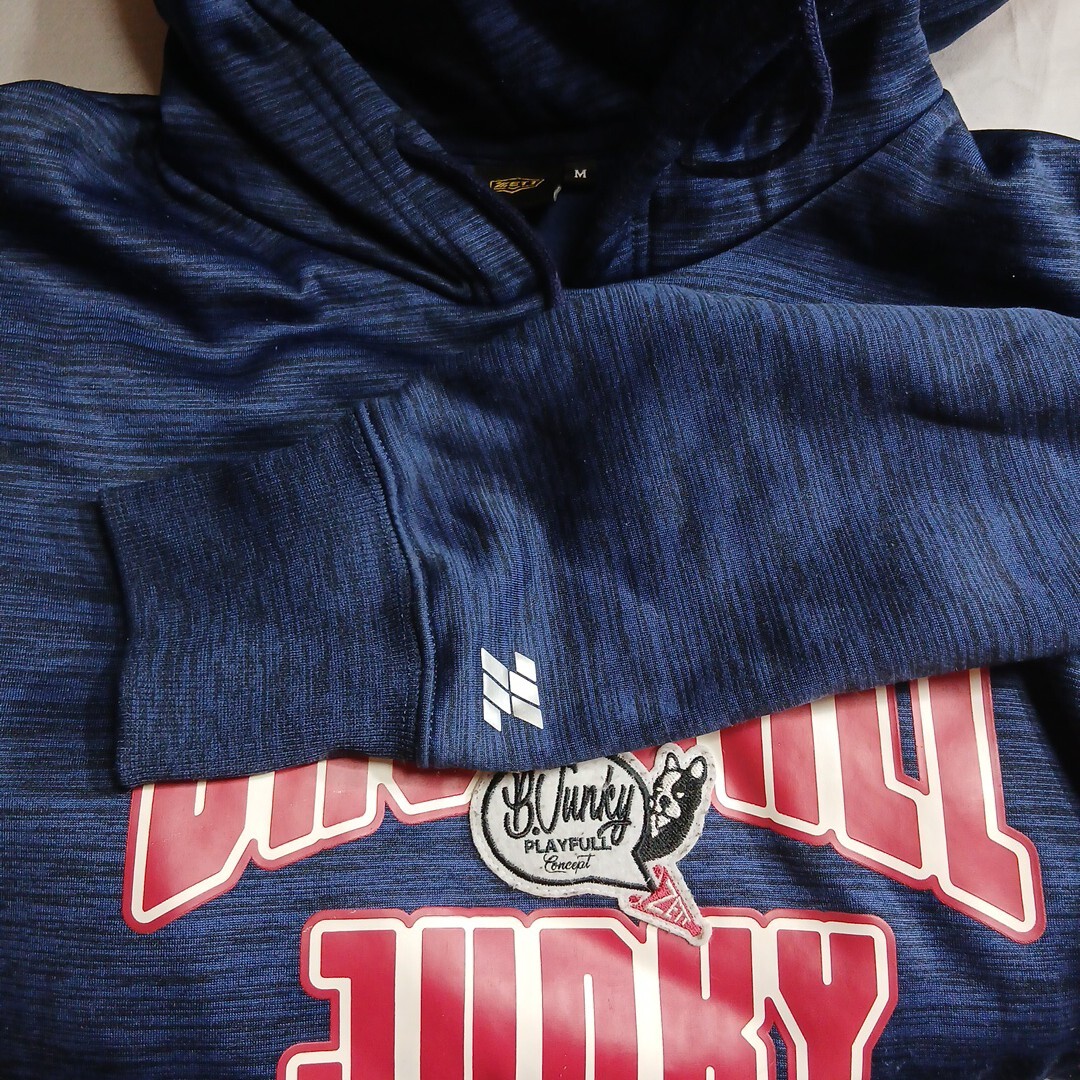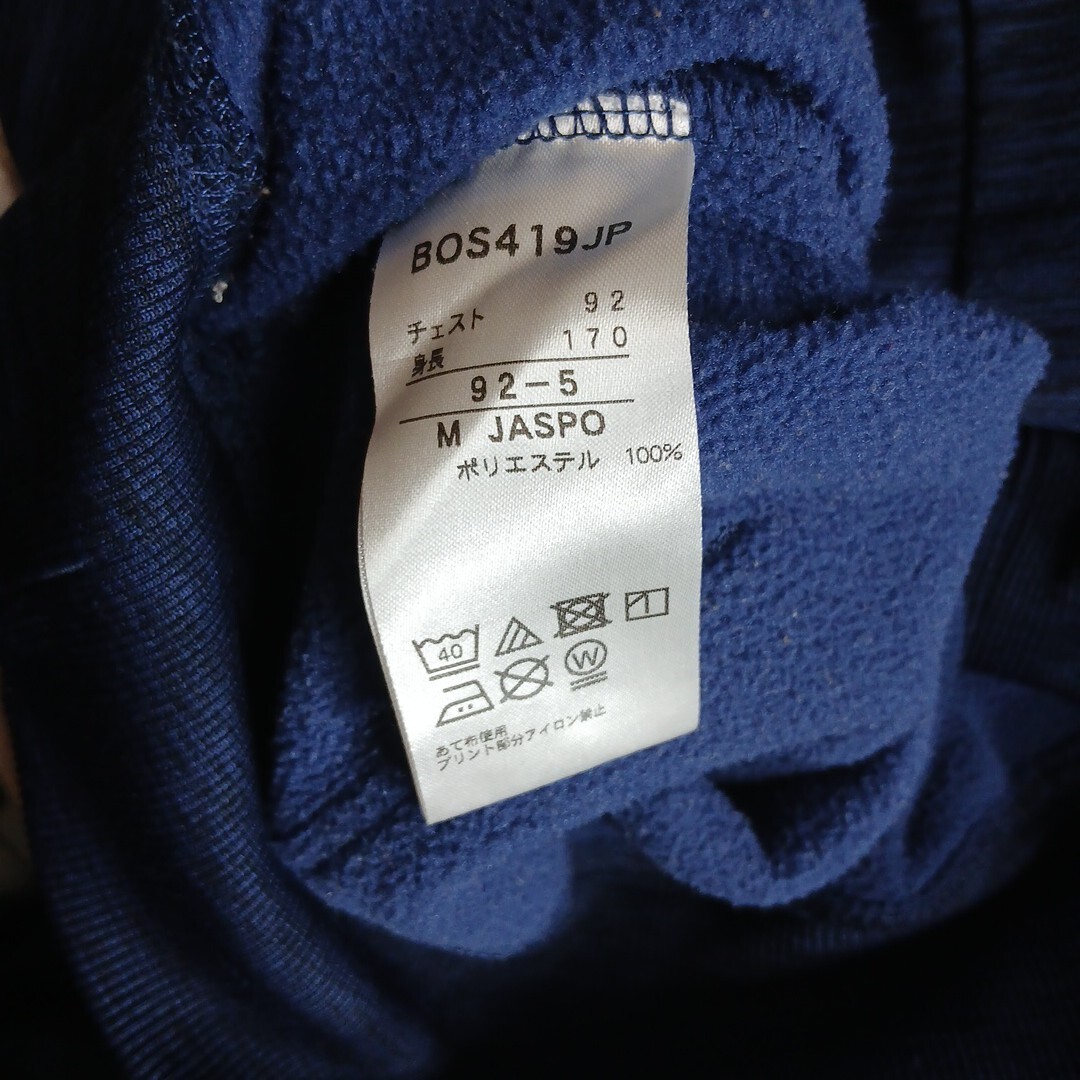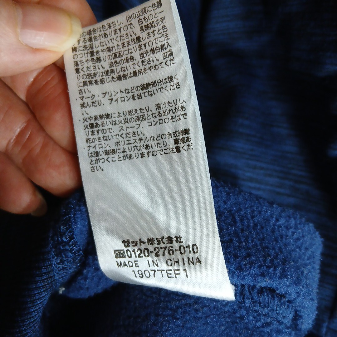 ゼットのベースボールジャンキーのパーカーです。サイズはMで、実寸でおおよそ肩幅49センチ、身幅49センチ、着丈63センチ、袖丈56センチです。素材は、ポリエステル100%です。色は、青色です。多少使用感などございますが特に目立つキズや汚れは無いと思います。