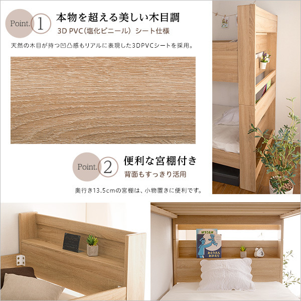 【ポイント】 子供から大人まで使えるシンプルデザインの宮付き二段ベッドです。 木目調の3D PVCシート仕様で、本物以上に高級感溢れる仕上がりです。 通気性のあるすのこ床を使用しており、すのこ下の反り止めを3本使用した安心構造です。 耐荷重は約300kgの頑丈設計です。 上段下段を離しても使用できるので、シングルベッド2台としても使用できます。 |