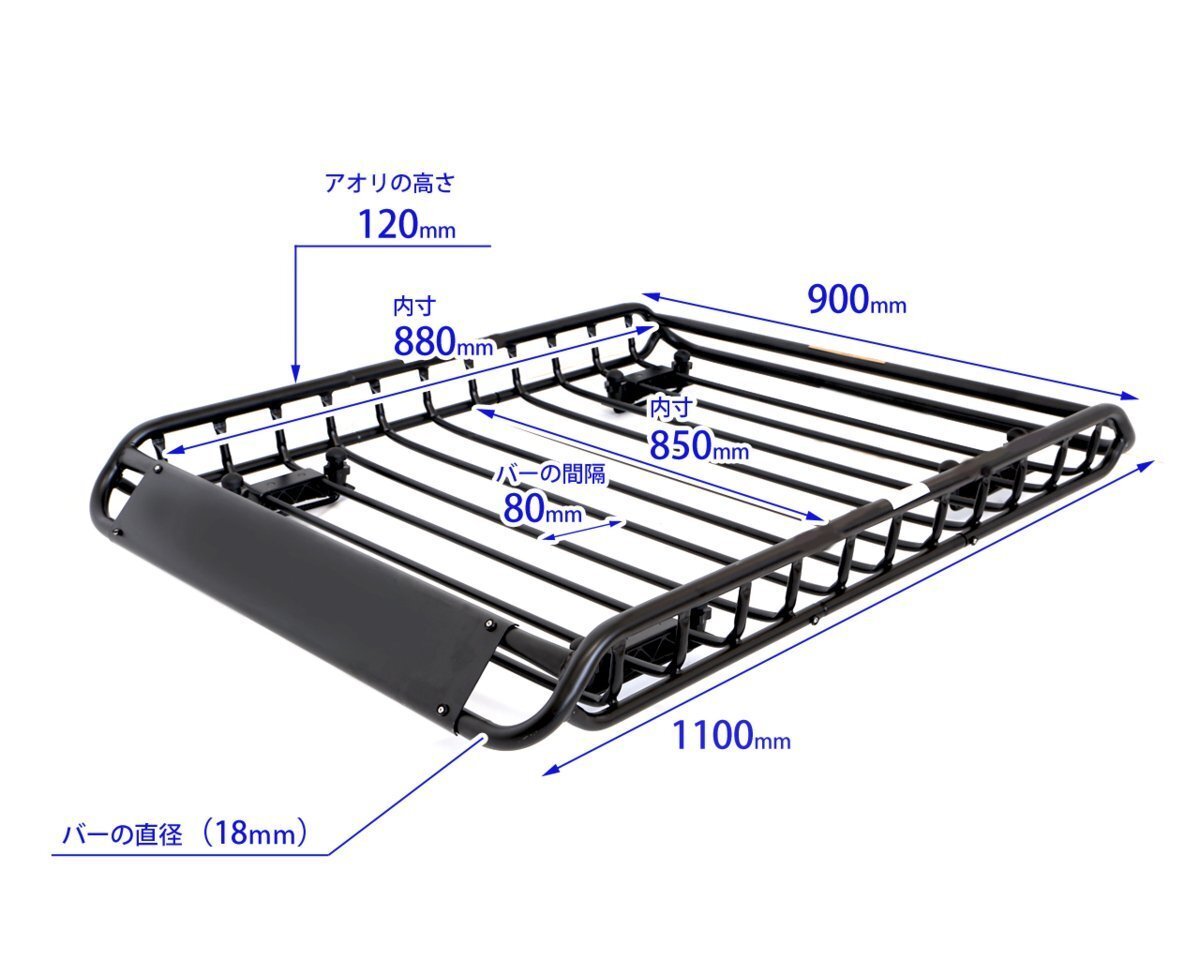 | 仕様 | 製品サイズ:W900×D1100×H120(mm) ラック内寸:W850×D880×H90(mm) 適応ベースキャリアバーの寸法:最大100mm×30mm 耐荷重:50kg 材質:鉄製 付属品:フィッテングキット4個 付属品:さび止め用キャップ8個 カラー:ブラック 重量:9kg |