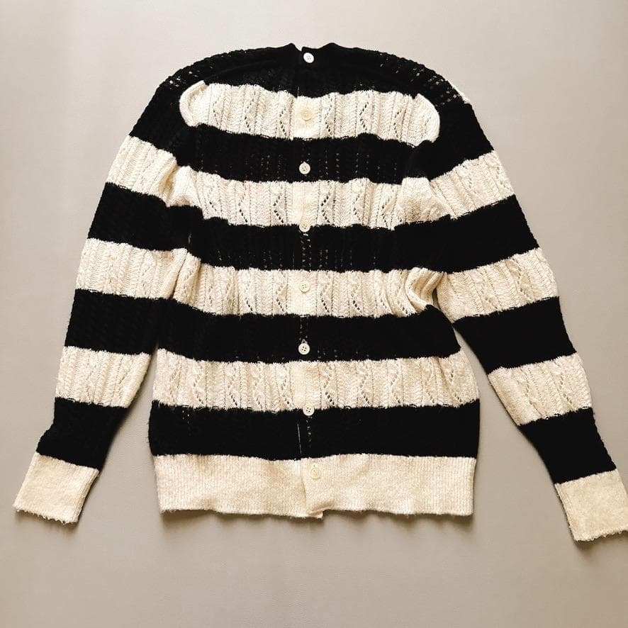 ![]() ボーダー×花刺繍が目を惹く、tao COMME des GARCONSの23SSフラワーニット。背面ボタン仕様で後ろ姿まで可愛い一枚です。 【ブランド】tao COMME des GARCONS/タオ コムデギャルソン 【商品名】 Tao アクリルダム×梳毛ボーダー透かし柄ニット(SHUN SUDO) フラワー刺繍 ボーダー バックボタンニット 【カテゴリ】レディース/ニット・セーター 【型番】TK-N022 【定価】64,900円の記載例あり(取扱店情報参照) 【カラー】ブラック×ホワイト(花刺繍:イエロー系) 【素材】 ウール58% アクリル27% ナイロン15% 【サイズ】S 【平置き採寸】 肩幅42/袖丈58/身幅57.5/着丈62(cm) ※素人の採寸故、多少の誤差はご容赦ください。 【コンディション】 全体は良好ですが多少の使用感あります。 素材特性上の毛羽立ち・毛玉はご容赦ください。 付属ボタン1個あり。 アイテム説明 tao 2023ssコレクション 現代アート作家"SHUN SUDO"のフラワー刺繍がワンポイント。太ピッチボーダーとケーブル編みをミックスし、軽やかな透け感が出る編地。前後どちらでも着られるようなデザインバランスで、レイヤードも楽しめます。 要素 クルーネック/長袖/ケーブル×透かし編み/太ピッチボーダー/胸元フラワー刺繍/背面ボタン開き/日本製/手洗い不可・ドライ推奨 シーン デイリー きれいめカジュアル 美術館 カフェ お出かけ 旅行 【その他】 ・中古・自宅保管品につき完璧を求める方はご遠慮ください。 ・発送は折りたたみ、匿名配送予定です。 ・撮影小物は付属しません。_ _ _¥ギャルソン _¥ニット C787-15/11 |
