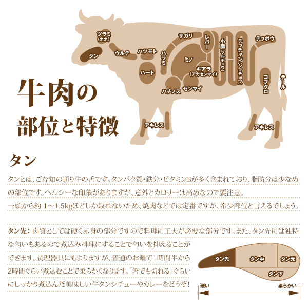 | 肉質としては硬く赤身の部分ですので料理に工夫が必要な部分です。また、タン先には独特な匂いもあるので煮込み料理にすることで匂いを抑えることができます。調理器具にもよりますが、普通のお鍋で1時間半から2時間ぐらい煮込むことで柔らかくなります。「箸でも切れる」ぐらいにしっかり煮込んだ美味しい牛タンシチューやカレーをどうぞ! |