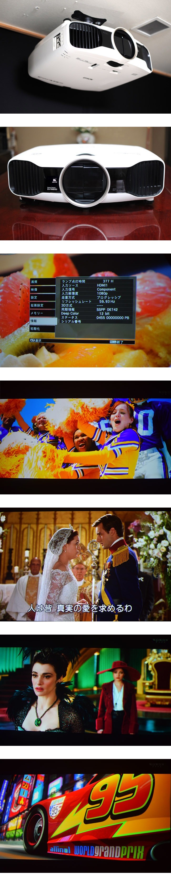 色彩鮮やかに濃密な映像が映し出されています。2400ルーメンの高輝度モデルだけあってスクリーン全体に力強さがあり、際立った鮮鋭感を感じます。DEEPBLACK効果による高い暗部階調表現力、引き締まった黒、漆黒のフルHD映像は秀逸です。特に、32万:1のコントラスト比は驚異的なコントラスト感で、前機種TW8000(コントラスト比20万:1)と見比べてみても格段に進化しているのがわかります。緻密な描写力も素晴らしく、各シーンの背景の細部まで素材の質感がわかり、目の前の膜を数枚取り除いたような繊細な描写による立体感や空気感、透明感を感じさせる高品位な映像表現には「透過型液晶プロジェクターもここまで来たか!」と感嘆します。実写映像は添付写真をご覧ください(120インチホワイトマットスクリーンに当出品機で実際に投射した映像です)。