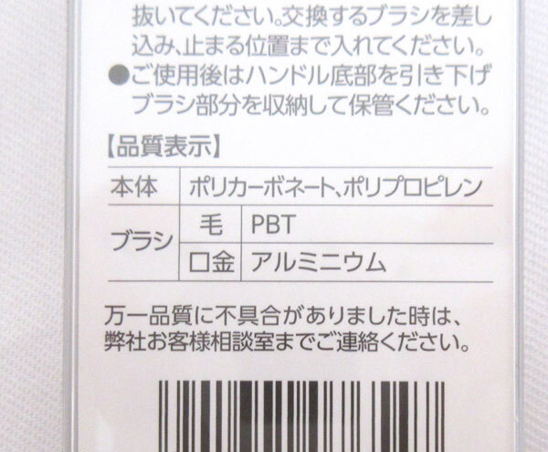 | 内 容 | ■貝印 マルチユーズブラシ リップセット KQ3257 ■サイズ 130×11×11mm ■材質 本体:ポリカーボネート、ポリプロピレン ブラシ毛:PBT ブラシ口金:アルミニウム ■付属のブラシ リップ:唇の輪郭をなぞりやすく、面をきれいに伸ばす リップやグロスをワンランク上の仕上がりに。 スライドキャップだから、毛先を保護しポーチを汚さず持ち運びが可能 |
