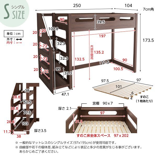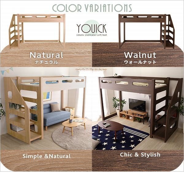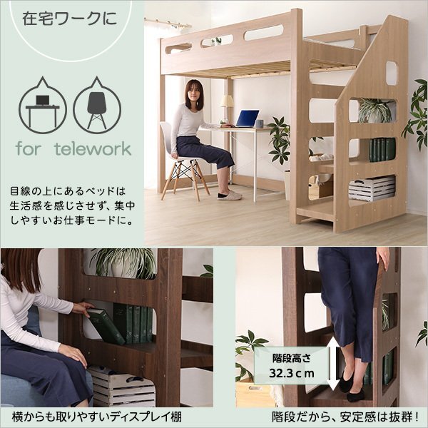 | 【ポイント】 子供から大人まで使えるシンプルデザインのロフトベッドです。 ロフト下の空間を自由に使えるので、子供部屋や在宅ワークスペースにぴったり。 階段付きなので、上り下りも安心です。 通気性のあるすのこ床を使用しており、すのこ下の反り止めを3本使用した安心構造です。 耐荷重は約300kgの頑丈設計です。 お部屋をすっきり、かわいく演出するナチュラルと、 シックにスタイリッシュに演出するウォールナットの2色展開です。 |