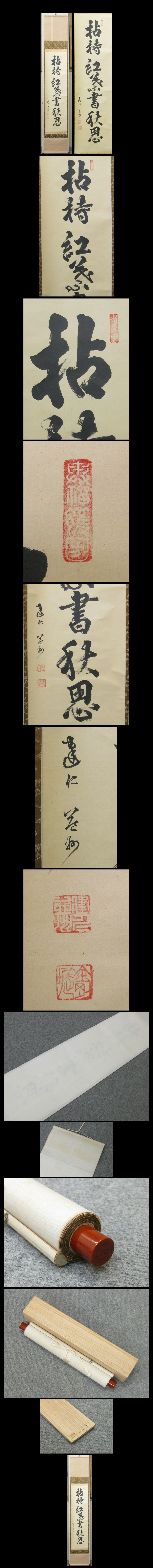 【竹田益州】 臨済宗建仁寺派445世、第8代管長。 1915年に建仁寺の竹田穎川に参じた後、その法嗣となり、竹田姓を名乗る。 また、1918年より祥瑞寺住職に就任。 その後、大徳寺山内塔頭の大仙院住職、大徳寺執事長などを歴任。 1945年建仁僧堂師家となり、54年4月に建仁寺住職、及び建仁寺派管長に就任。 茶道の造詣が深く、多数の自筆書や自作茶杓を残し茶陶器の箱書も多く残す。 ★商品サイズ★ ■掛軸 188×31cm ■作品 108×29.5cm ★商品の状態★ 作品は概ね良い状態です。 裏側上部に焼けがあります。箱蓋裏に欠損があります。 ご承知のうえご入札をお願いします。 時代など詳しくは画像にてよく確認のうえでご検討いただければと思います。 どうぞよろしくお願いいたします。 |