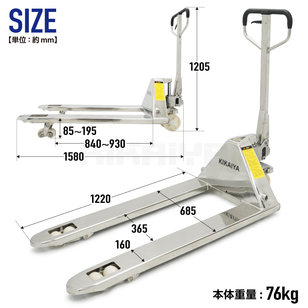 防錆仕様でクリーン環境にぴったり! 部品もステンレスなので食品関係などの使用でも安心 ●オールステンレスで錆によるトラブルがなく、安定して長くお使いいただけます ●フォークの全幅が685mmなので安定感があり、幅の広いパレットにも対応 ●ダブルフォークローラーなので段差に強く、重い荷物でも動き易くなっています ●フォーク先端にトウローラー(補助ローラー)が付いているので、 パレットに挿し込む際の段差をスムーズに越えられます ●ステアリング/フォークローラーともナイロン製で、湿った環境にも適応します ●食品業界などの衛生管理が重要な場所での使用に最適です ●下降用フットペダル付き ●工業製品国際規格CEマーク取得の一級品です |