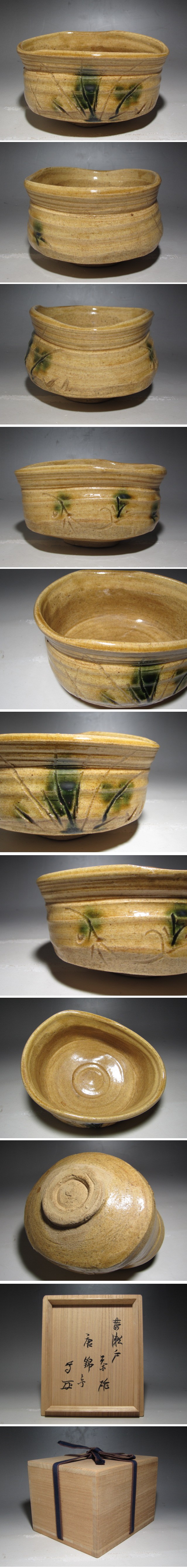 黄瀬戸茶碗「唐錦」です。 時代を感じる趣ある品です。 箱蓋裏に武者小路官休庵十三代有隣斎の花押があります。 サイズ 直径15.5cm/高さ9cm(多少の誤差はお許しください) 状態 一見して疵やヒビ・直しは見られません。 骨董品という事をご勘案頂き、時代経過のスレや、小さな傷がある場合があるかもしれませんのでご承知置きください。 | |||