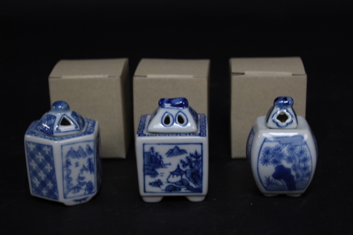 ■商品においての追記説明 その他 連絡事項■染付の小型の豆香炉3個セットです。3種類です。特価品 高さ平均7cm幅5cmです。 ケース入り ※商品の状態は上記商品情報説明と画像にてご確認下さい。※当該商品は実店舗と在庫を共有しているため、在庫更新のタイミングにより、在庫切れの場合、やむをえずキャンセルさせていただく可能性があります。※料全国一律:600円 一部無料料の商品もございます。縦横奥行きが170cm超大型商品の沖縄、離島への発送は別途有料見積もりになります。※商品到着後、7日以上経過した商品はいかなる場合も返品をお受けできません。※商品返品についてお届け商品が、ご注文の品と違った場合。商品の寸法などが、商品説明と著しく違う場合。(多少の誤差はこれに該当しません)真作・本物保証にもかかわらず、真作・本物でなかった場合。お届け商品が、破損していた場合。※お客様の御都合の場合往復送料とシステム利用料約10%ご負担いただきます。