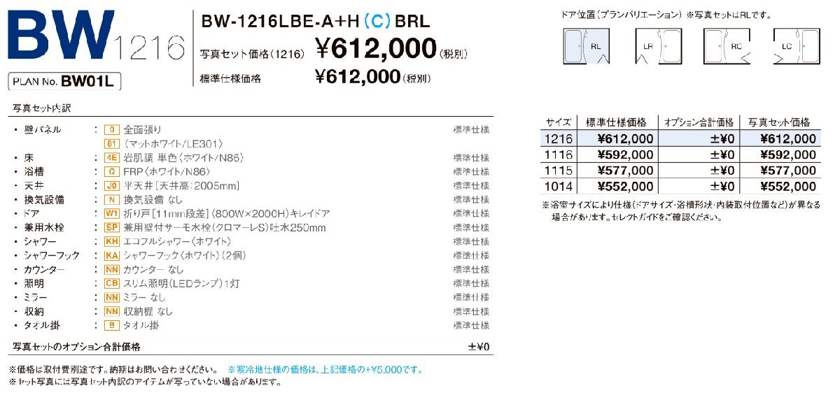 | ◎LIXIL集合住宅用ユニットバス[1216サイズ] BW-1216LBE+H 即決価格は、写真セット価格612.000円のなんと 71%OFFで 195.228円【消費税込】 ◆据付必要寸法1280×1680×2494mm。 ◆浴槽と洗い場床が分割構造、ラクに搬入・ラクに施工。 ◆低床設置で、浴室への出入りがしやすい、浴室入口段差11mm。 ◆浴槽への出入りがしやすい、またぎ高さは約450mm。 ◆翌朝にはサラリと快適、イージードライフロア。 ◆照明は、スリム照明(LEDランプ)です。 ◆スッキリデザインで汚れにくく、お掃除しやすい『キレイドア』折り戸。 ◆ドア位置は4通り(RL・RC・LR・LC)から選択できます。 ◆追い焚きアダプターは価格に含まれていません。 ◆天井換気扇は付いていません。 | |