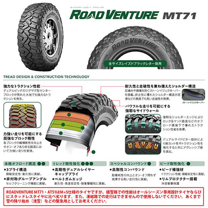 | ご覧いただき誠にありがとうございます。 お急ぎの場合は入札前に質問欄で予定に間に合うかどうかの確認をしてください。 迅速、丁寧を心掛けております。ご安心して取引ください。 タイヤメーカー:クムホタイヤ ロードベンチャー MT71