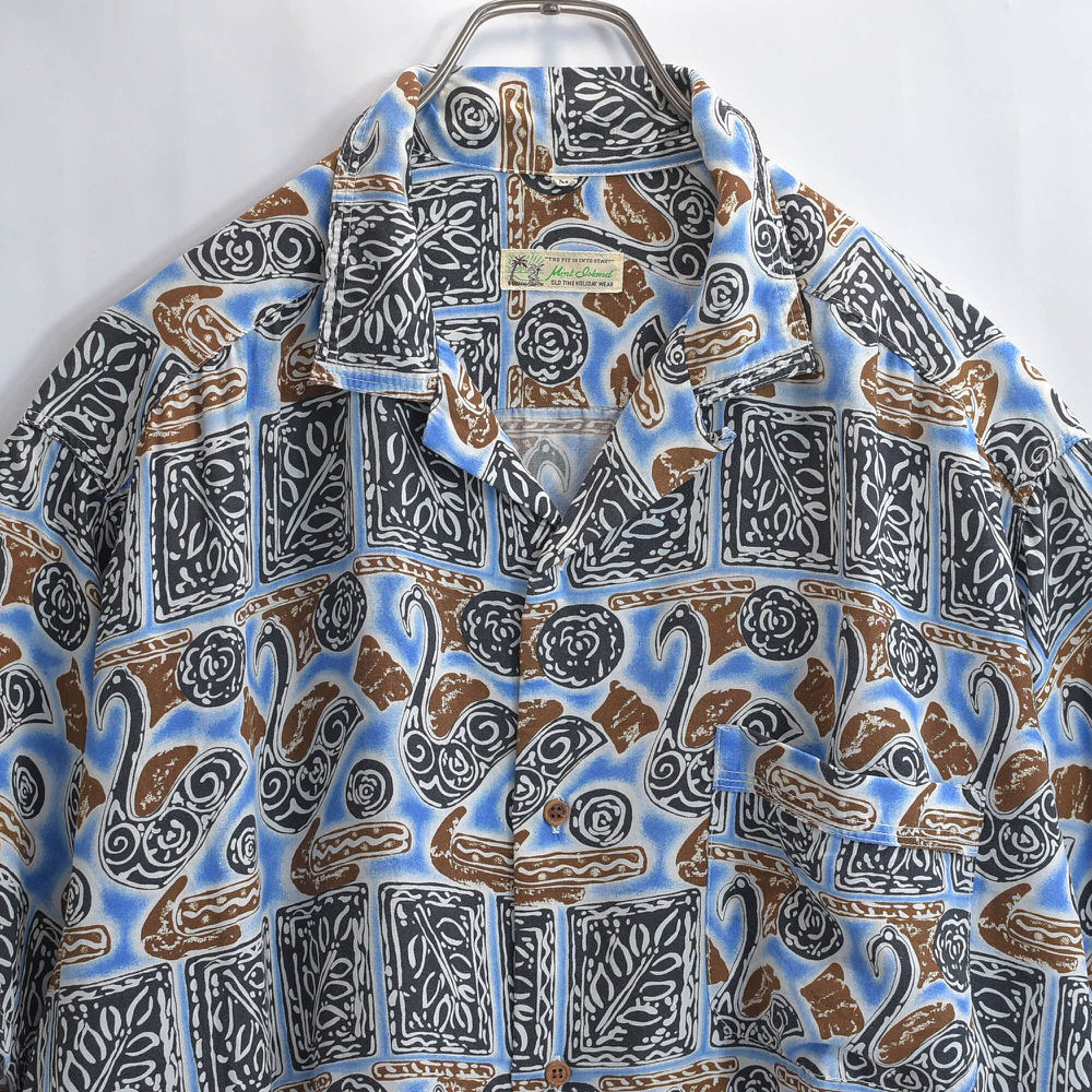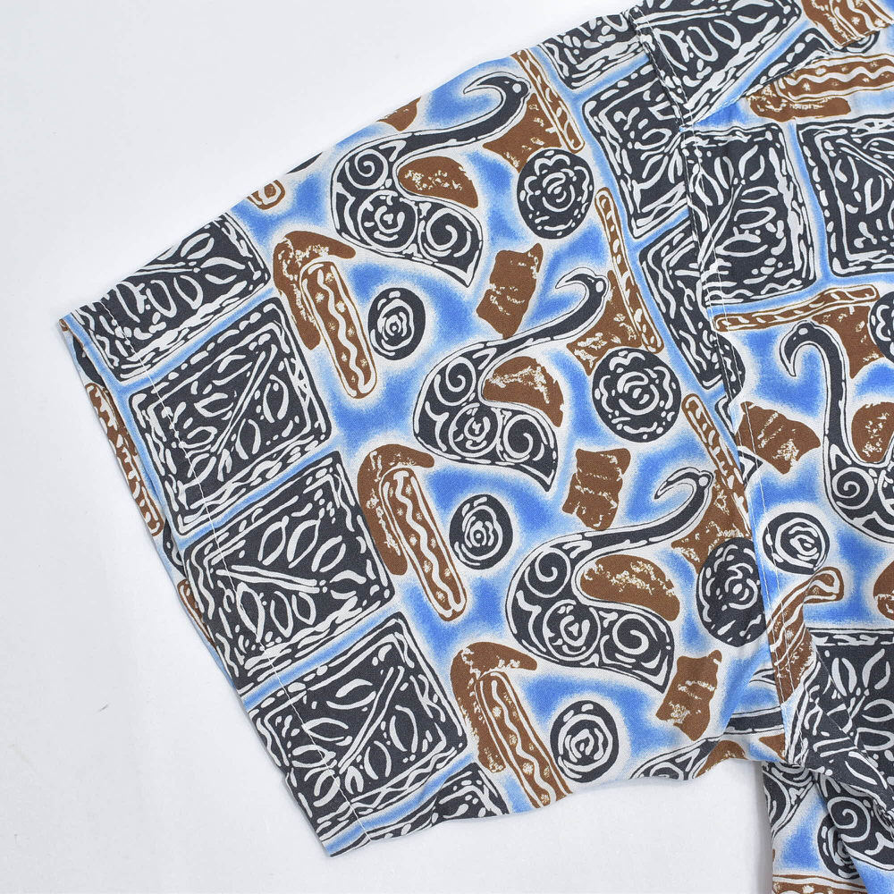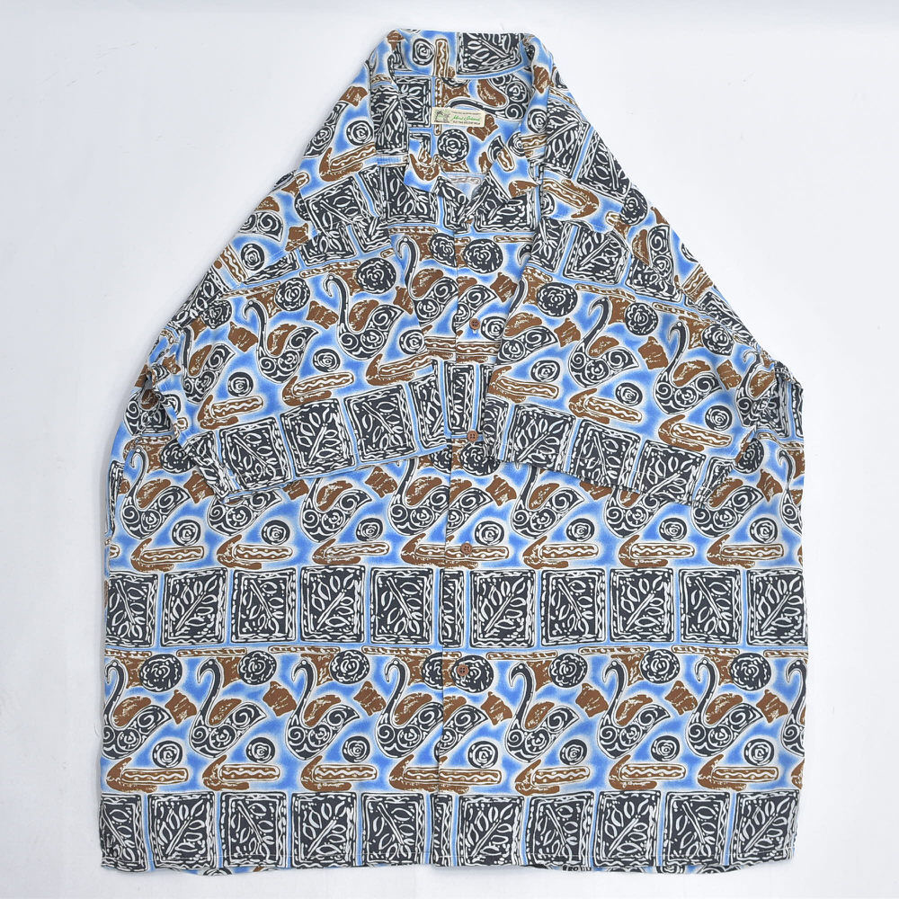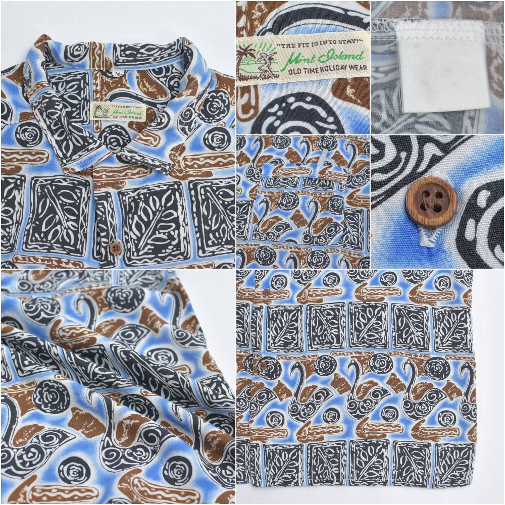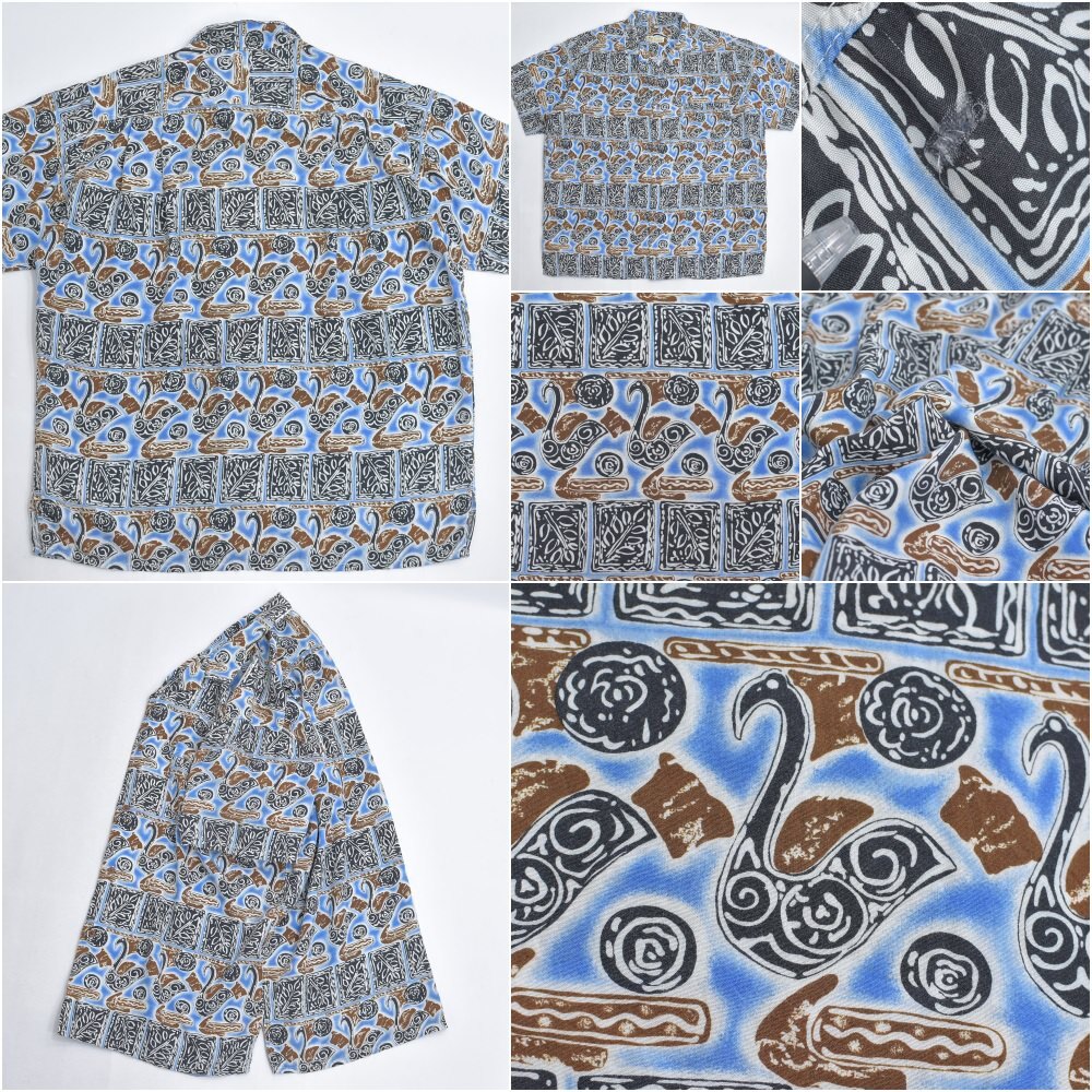90s~ Mint Island ミントアイランド オープンカラー レーヨン 総柄 アロハシャツ 開襟 白鳥 スワン 幾何学 アート ヴィンテージ ネイビー ビンテージ 古着 メンズL相当【商品説明】ねえ、そこの白鳥さんモダンアートのギャラリーで、いったい何を考えているのなんて、思わずシャツに話しかけてしまいそうになるブルーのキャンバスの上で、彼らは気ままな休日を満喫中カクカクしたタイルは、もしかしたら彼ら専用のダンスフロアなのかもしれない傍らでくるくると渦を巻く模様は、きっとご機嫌なDJのスクラッチ見た目はこんなに優雅なのに、案外パーティー好きなのかもしれませんねこのシャツ、白鳥の湖ならぬ、レーヨンのオアシス袖を通せば、そのとろける様な肌触りに、思わずため息がこぼれるはず退屈な日々に、ちょっとしたユーモアと、こなれた抜け感をこれを着て出かければ、いつもの景色も少し違って見えるかもおすすめの一枚です【実寸】・着丈 約76cm襟付け根から・身幅 約65cm・肩幅 約47.5cm・袖丈 約23cm・ゆき丈 約48cm【表記サイズ】・size ML相当の大きめな作りになりますLサイズとさせていただきます【参考着用感】・172cm73kgのメンズで、Tシャツの上から少しゆとりがある感じで着用出来る体感少し大きめなLといったサイズ感です着丈はお尻の8割ほどが隠れる程度の丈感です※必ず実寸をご確認お願い致します【ブランド】・Mint Island【生産国】・タグ記載なし【素材】・タグ記載なし素材感からrayonだと思われます【状態】・使用感や、画像のように左袖の肩よりに穴のダメージがありますが、その他目立つ汚れ、ダメージは見当たらず、日常的に古着を着用されている方であれば問題なく着用して頂けると思いますホームクリーニング済みです画像と合わせてご確認下さい#その他のアイテムはこちらからgdmitem#gdm64697/16~7/18海外買い付けの為期間ご購入の発送は7/19以降となります