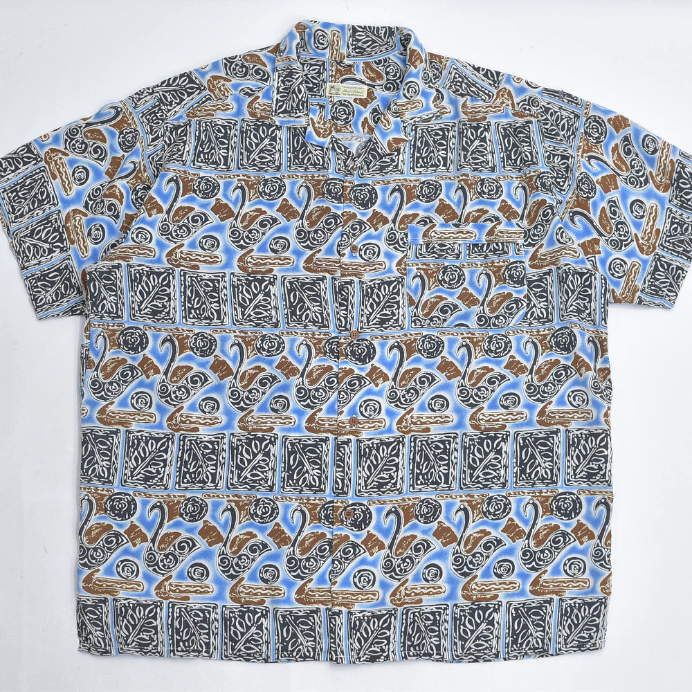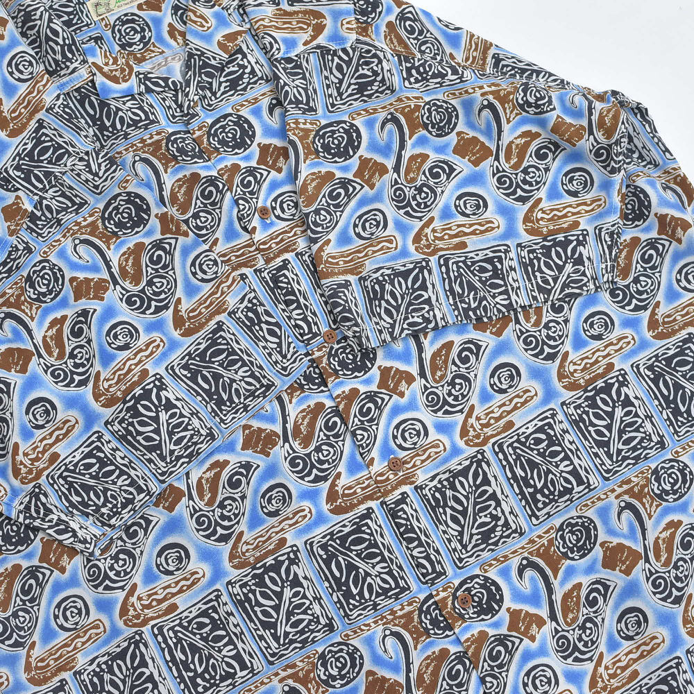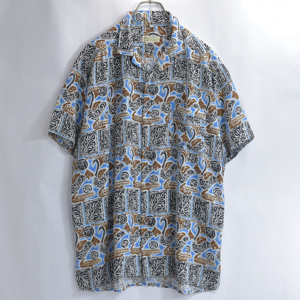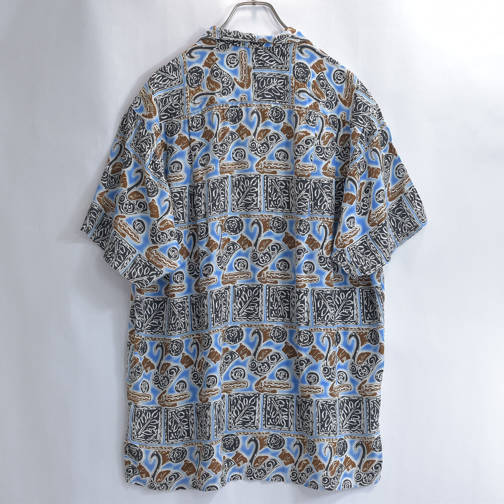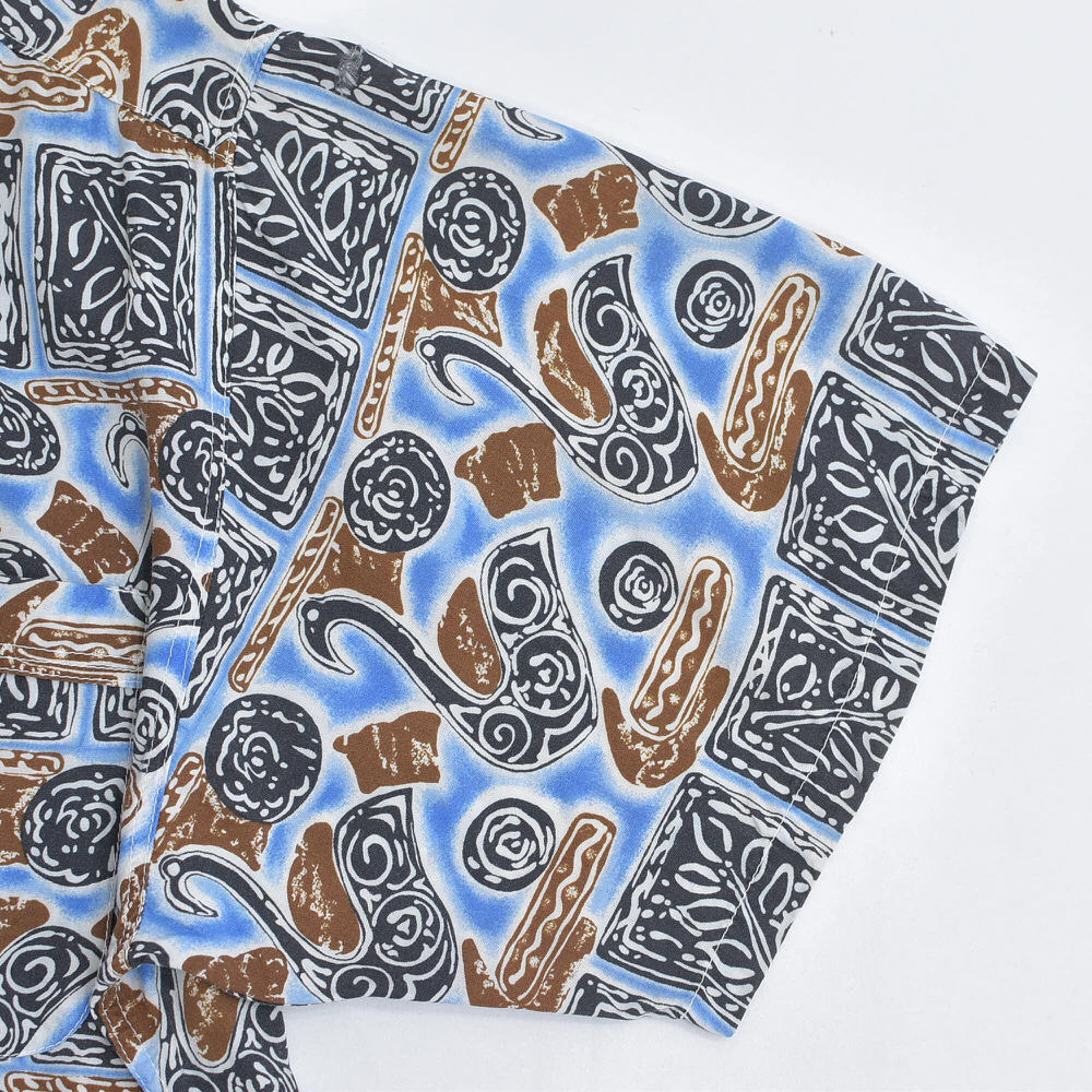 90s~ Mint Island ミントアイランド オープンカラー レーヨン 総柄 アロハシャツ 開襟 白鳥 スワン 幾何学 アート ヴィンテージ ネイビー ビンテージ 古着 メンズL相当【商品説明】ねえ、そこの白鳥さんモダンアートのギャラリーで、いったい何を考えているのなんて、思わずシャツに話しかけてしまいそうになるブルーのキャンバスの上で、彼らは気ままな休日を満喫中カクカクしたタイルは、もしかしたら彼ら専用のダンスフロアなのかもしれない傍らでくるくると渦を巻く模様は、きっとご機嫌なDJのスクラッチ見た目はこんなに優雅なのに、案外パーティー好きなのかもしれませんねこのシャツ、白鳥の湖ならぬ、レーヨンのオアシス袖を通せば、そのとろける様な肌触りに、思わずため息がこぼれるはず退屈な日々に、ちょっとしたユーモアと、こなれた抜け感をこれを着て出かければ、いつもの景色も少し違って見えるかもおすすめの一枚です【実寸】・着丈 約76cm襟付け根から・身幅 約65cm・肩幅 約47.5cm・袖丈 約23cm・ゆき丈 約48cm【表記サイズ】・size ML相当の大きめな作りになりますLサイズとさせていただきます【参考着用感】・172cm73kgのメンズで、Tシャツの上から少しゆとりがある感じで着用出来る体感少し大きめなLといったサイズ感です着丈はお尻の8割ほどが隠れる程度の丈感です※必ず実寸をご確認お願い致します【ブランド】・Mint Island【生産国】・タグ記載なし【素材】・タグ記載なし素材感からrayonだと思われます【状態】・使用感や、画像のように左袖の肩よりに穴のダメージがありますが、その他目立つ汚れ、ダメージは見当たらず、日常的に古着を着用されている方であれば問題なく着用して頂けると思いますホームクリーニング済みです画像と合わせてご確認下さい#その他のアイテムはこちらからgdmitem#gdm64697/16~7/18海外買い付けの為期間ご購入の発送は7/19以降となります