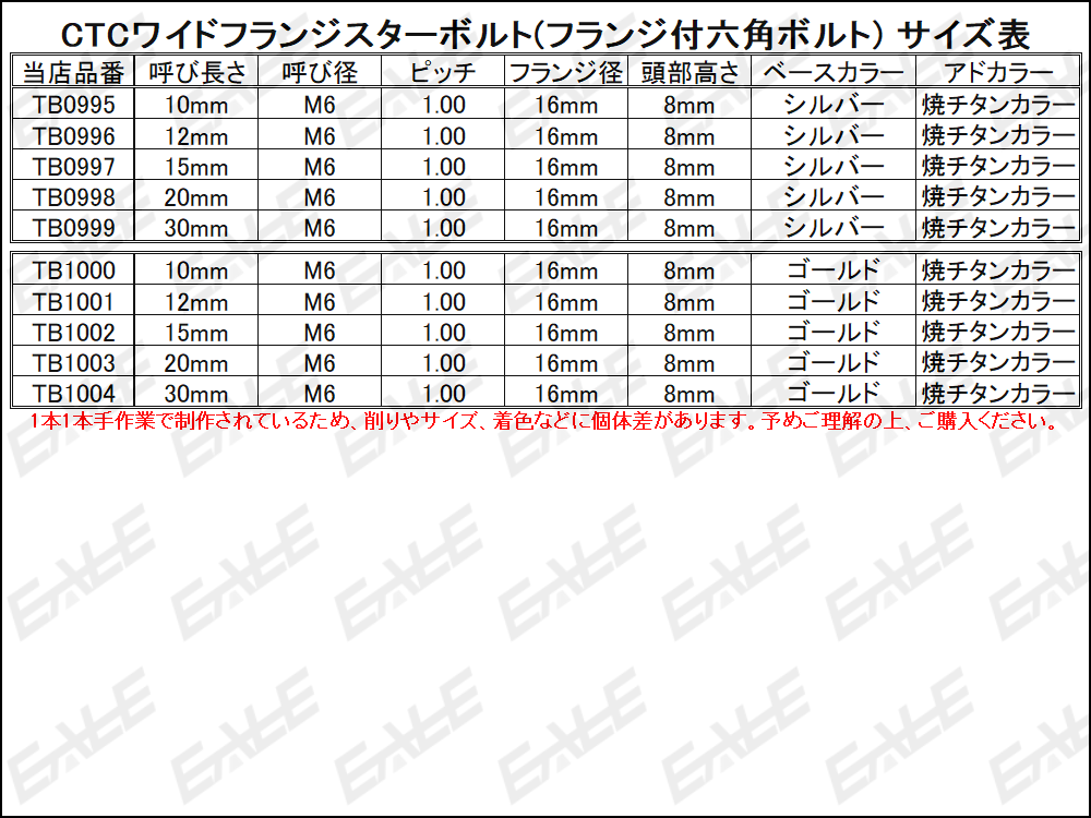 M6 CTCワイドフランジスターボルト (フランジ付六角ボルト) 丁寧に削り出されたボルトは、金メッキを施した上に特殊な方法で焼チタンカラーを再現した美しい仕上がりで、特にヘッド部分は穴あけ加工され、ボルトトップ内が花のような模様になった普通のボルトにはない仕上がりです。 またワイドにしたフランジ部分には、星形の削り込みを施した手の込んだ作りになっています。 ステンレスを使用しているので強度も十分にあり、広い座面で密着度を上げ、しっかりと固定したい場所に使用して頂けるよう各種サイズを用意しました。 また穴あけ加工されたヘッドはワイヤーロックが可能です。 ※出品は右記およびタイトルの“呼び長さ”“カラー”です。 ご落札後の変更はお受けできませんので必ずご確認下さい。 他の呼び長さは⇒ こちら 同デザインで違う呼び径・呼び長さ・カラーは⇒ こちら その他の六角ボルト・キャップボルトは⇒ こちら その他のボタンボルトは⇒ こちら その他のネジ(ビス・スクリュー)は⇒ こちら その他のナット・ワッシャーは⇒ こちら |
