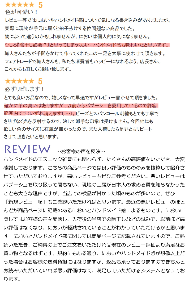 当店のバブーシュはすべてモロッコの職人さんが手作りで作製したものです。工場で作った大量コピー製品ではないので小さな傷・汚れ、染色の際のむら、ボンドのはみだし、ボールペンの跡、若干のサイズの誤差、同じデザインでも左右非対称、入荷時によって画像とのデザインやスパンコールの色の違いなどのハンドメイド感についてはご了承のうえ、ご注文をお願いいたします。上記のことを踏まえての価格設定となっております。